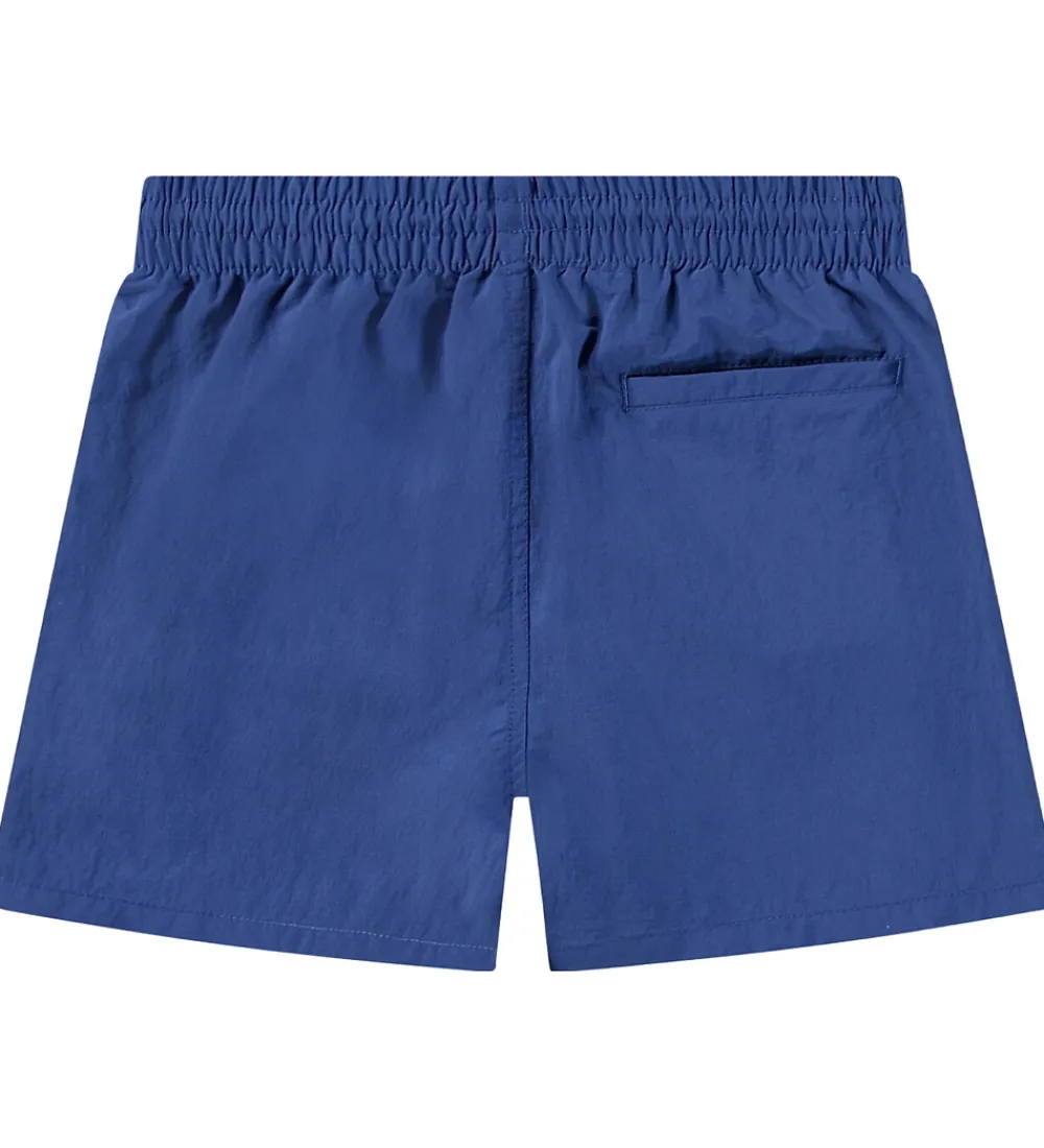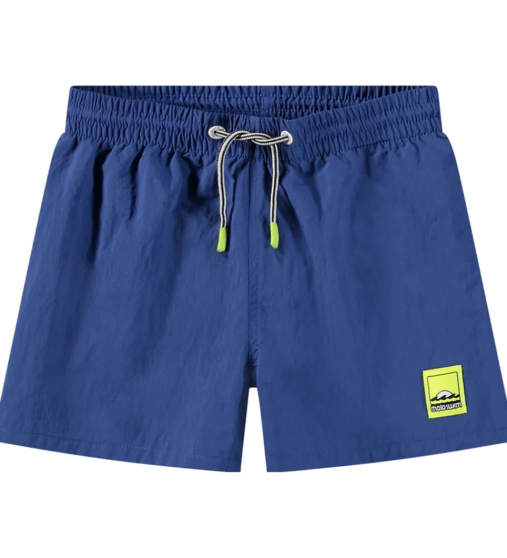 Smarte Molo badeshorts i blå med et logo på venstre lår i neongul. Badeshortsene har en god elastik i taljen, som kan justeres med snøre. Bagpå er der en praktisk lomme. Indvendigt er der net med elastik i benåbningerne.