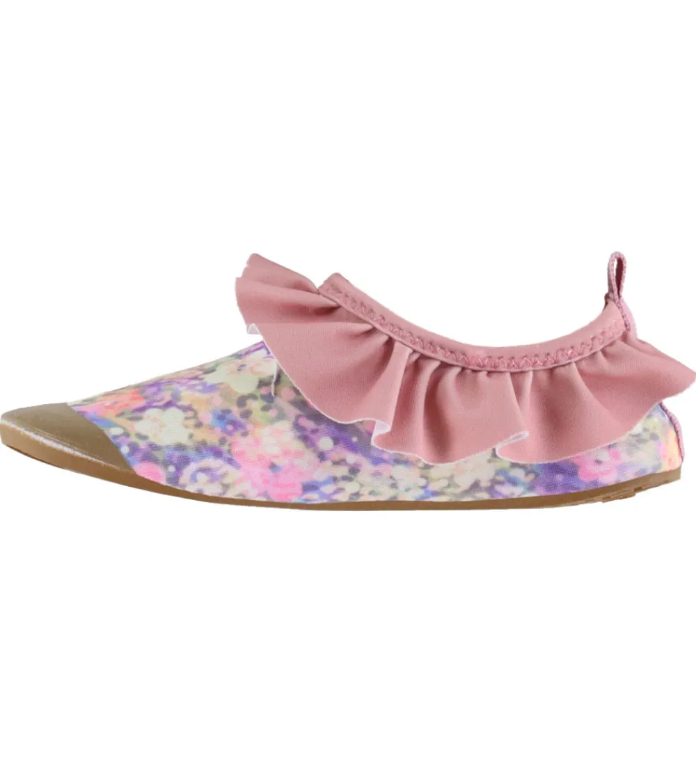 Fine Mikk-Line badesko i blomstret design med en rosa flæsekant omkring åbningen og brune detaljer.