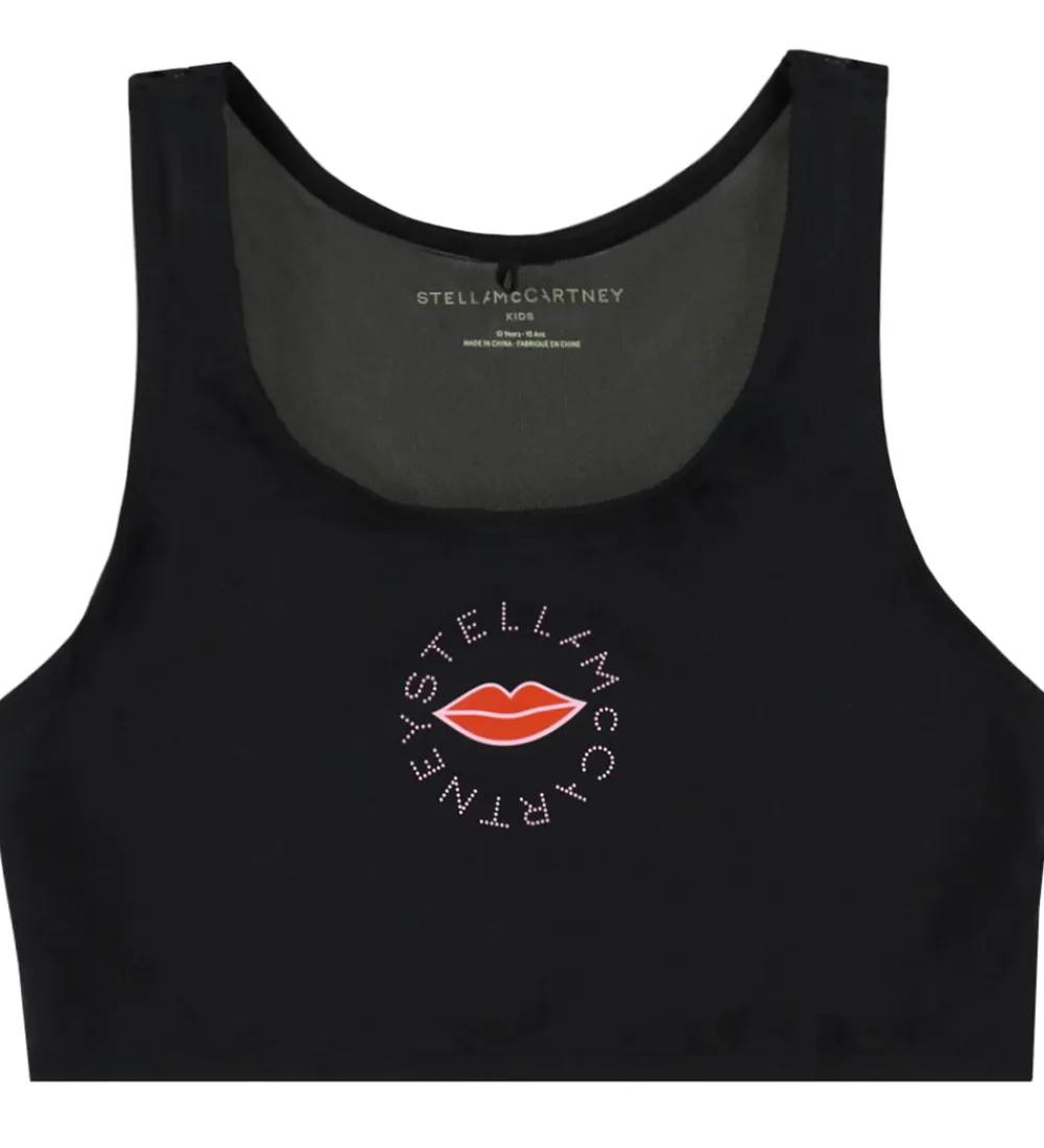 Sej Stella McCartney Kids badetop i sort, og fortil er der trykt et par læber i rød og rosa.