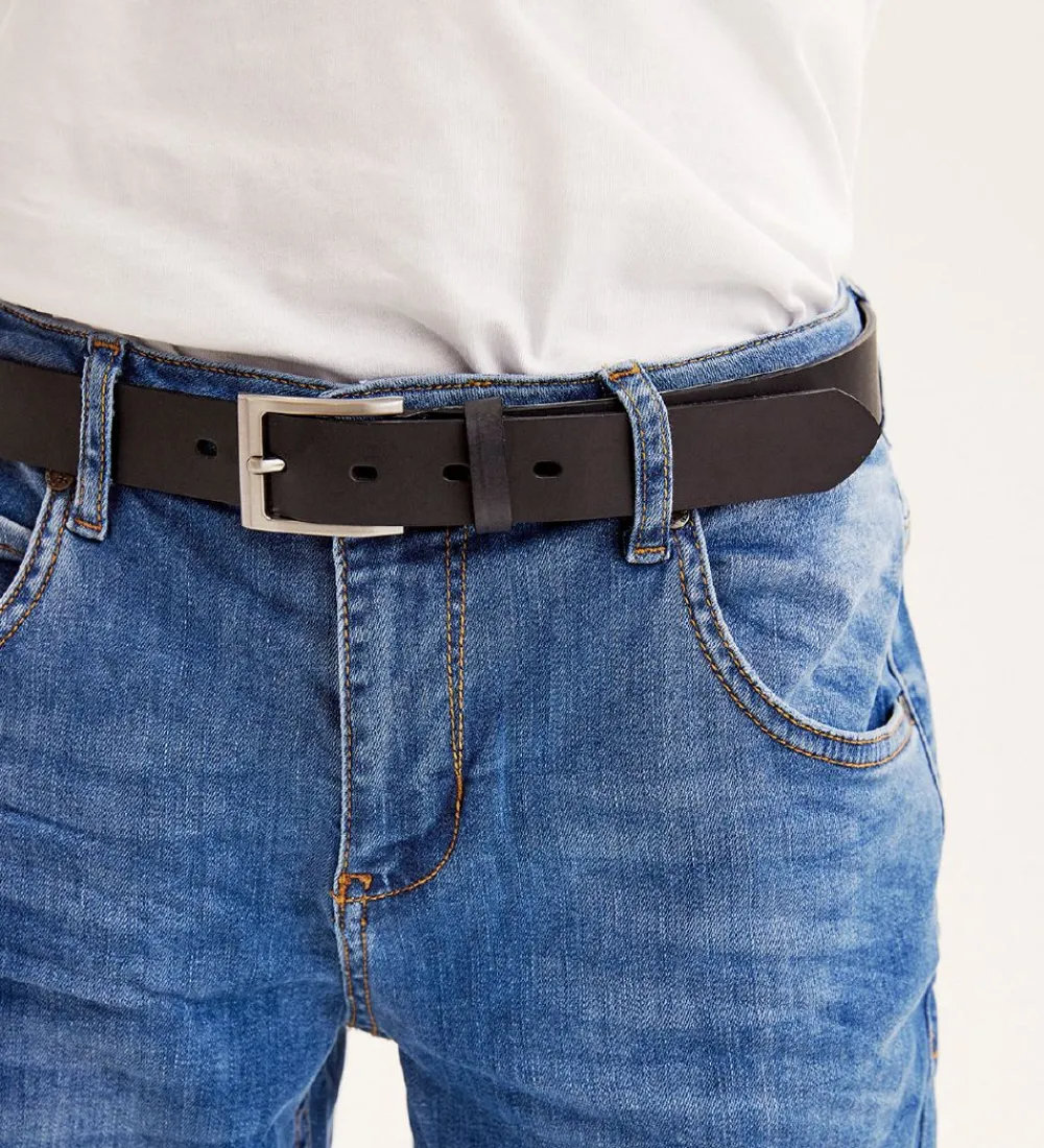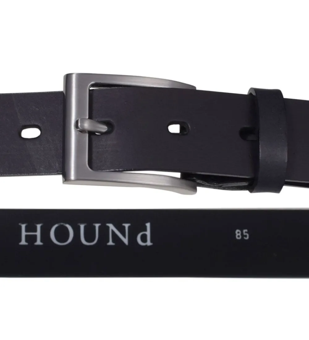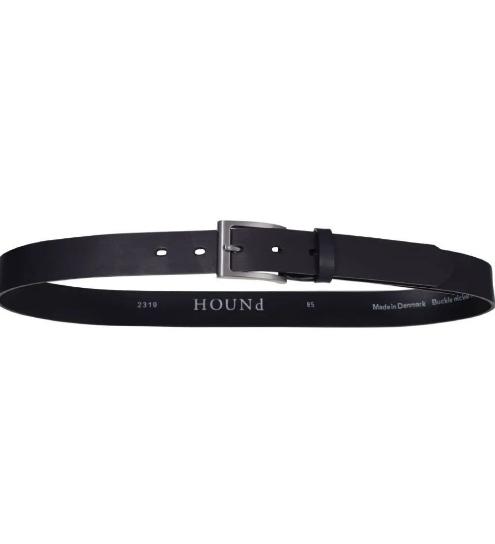 Fin Hound bælte med en smal, sort rem i læder, og et firkantet bælte-spænde i sølvskinnende metal.