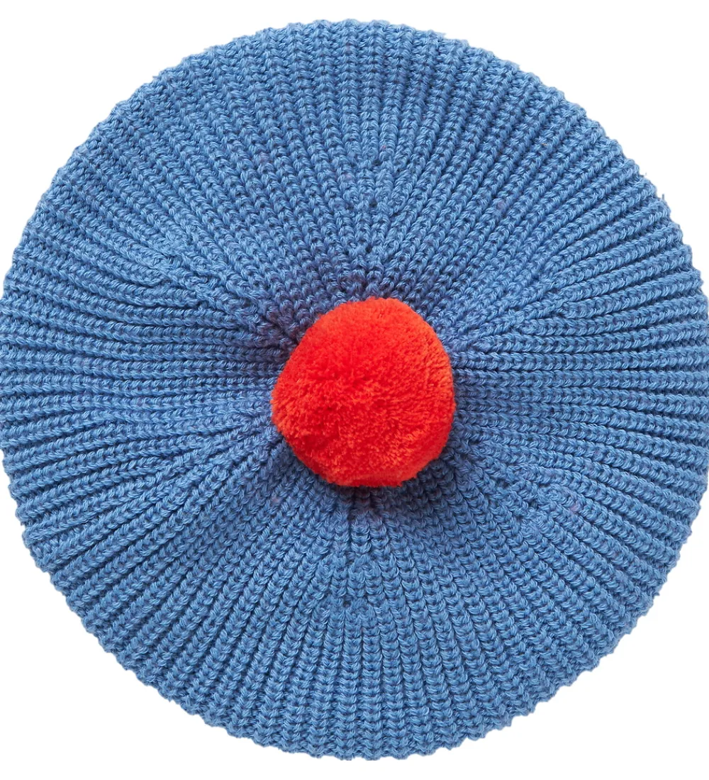 Elegant MarMar hue i blå nuance i en strikket kvalitet. Huen er dekoreret med en markant rød pompon på toppen, som tilføjer et stilfuldt touch. MarMar huen kombinerer et klassisk design med moderne elementer, hvilket gør den til et tidløst valg.