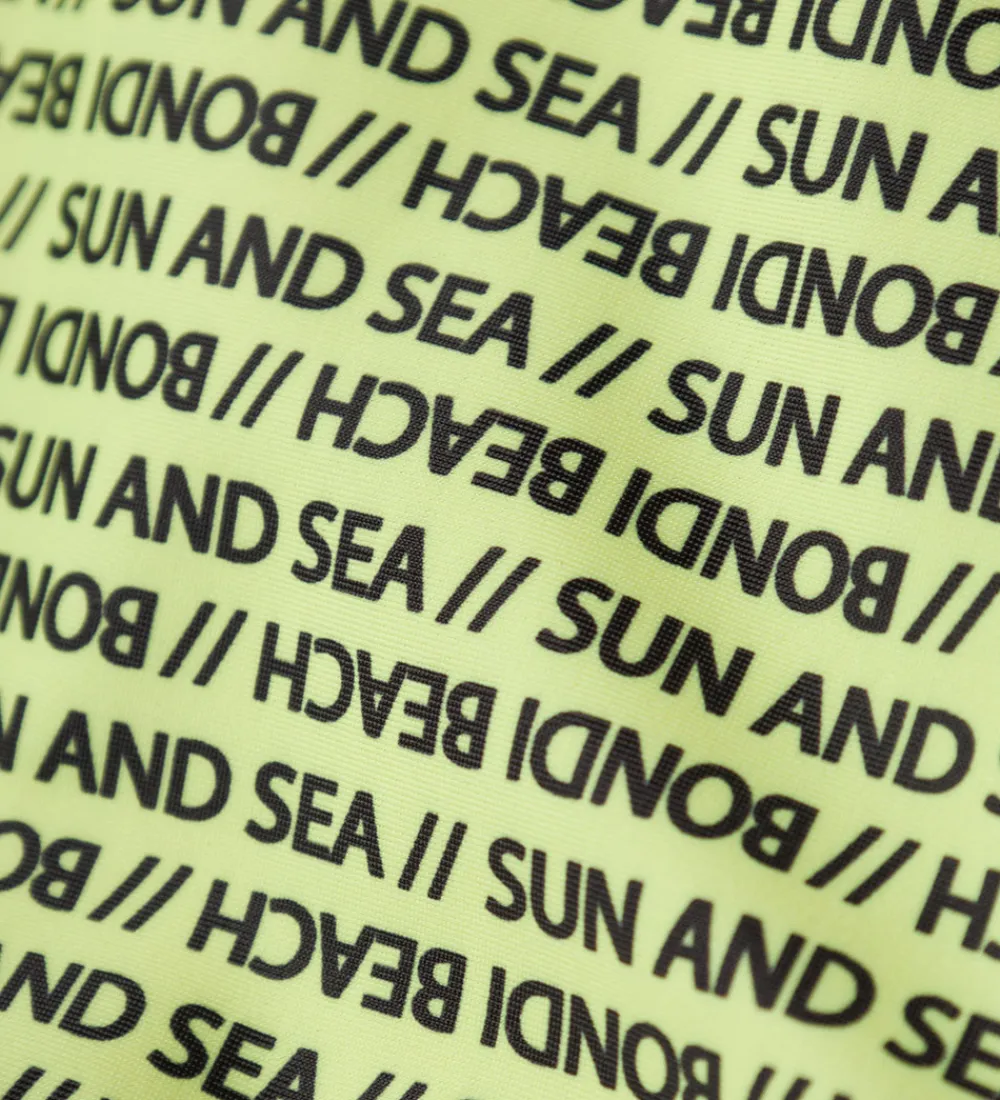 Smart Name It bikini i en klar grøn nuance med et mønster af tekst i sort, der siger “SUN AND SEA”. Bikiniens overdel har krydsende stropper og giver en moderne stil.