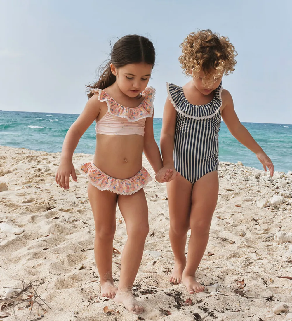 Wheat bikinioverdelen har smalle stropper og en dekorativ flæsekant ved halsudskæringen. Bikinitrusserne har også en flæsekant i taljen og elastik, som sikrer god pasform.