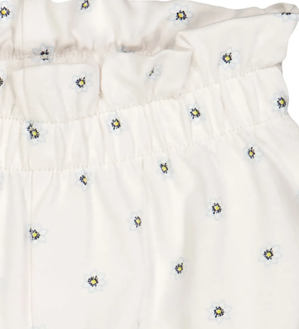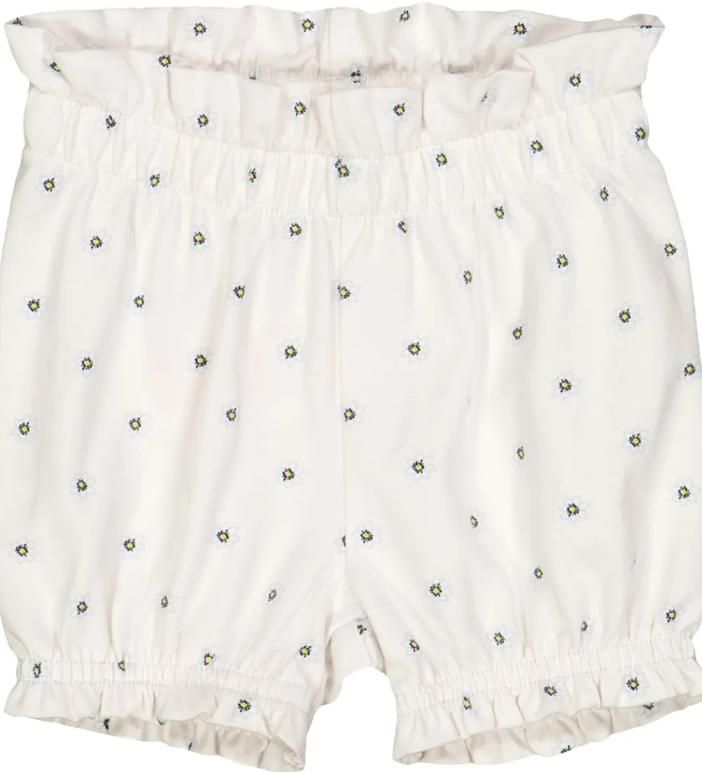 Behagelige Müsli bloomers i hvid med et fint blomsterprint i blå og gul. Müsli bloomersene har elastik i taljen og benene, hvilket giver en god og behagelig pasform.