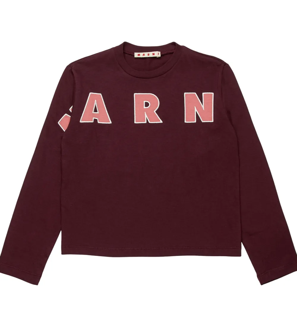 Elegant Marni bluse med lange ærmer i en dyb bordeaux farve. Fortil står der “Marni” med store, applikerede bogstaver i rosa med hvide kanter. Den runde halsudskæring sikrer en klassisk stil, mens det enkle design fremhæver Marni mærkets kendetegn.