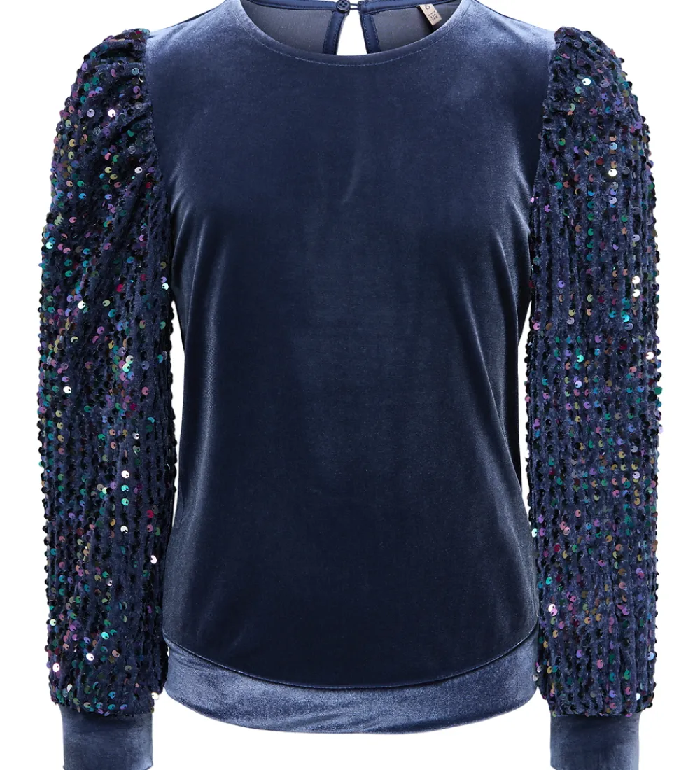 Elegant bluse fra Kids Only i en dyb, mørkeblå nuance. De lange ærmer er udsmykket med glitrende pailletter, i forskellige farver. Blusen har en rund halsudskæring og en lukning bagpå, som giver et stilfuldt udtryk. Kids Only kombinerer klassisk design med moderne detaljer i denne velourbluse.