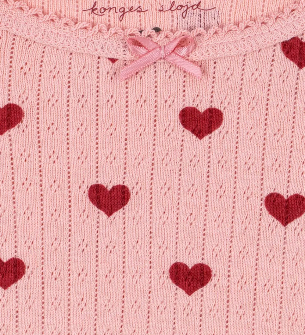 Sød bluse fra Konges Sløjd i rosa med røde hjerter og med et flot hulmønster. Konges Sløjd blusen har lange ærmer, og den har flotte blondekanter.