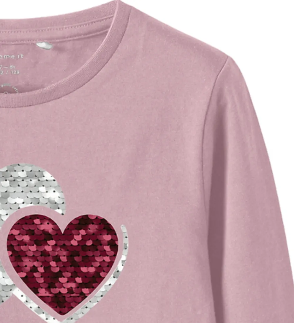 Festlig Name It bluse med lange ærmer i rosa med palietter på fronten, som danner to hjerter. Blusen har en rund halsudskæring med en smal ribkant.