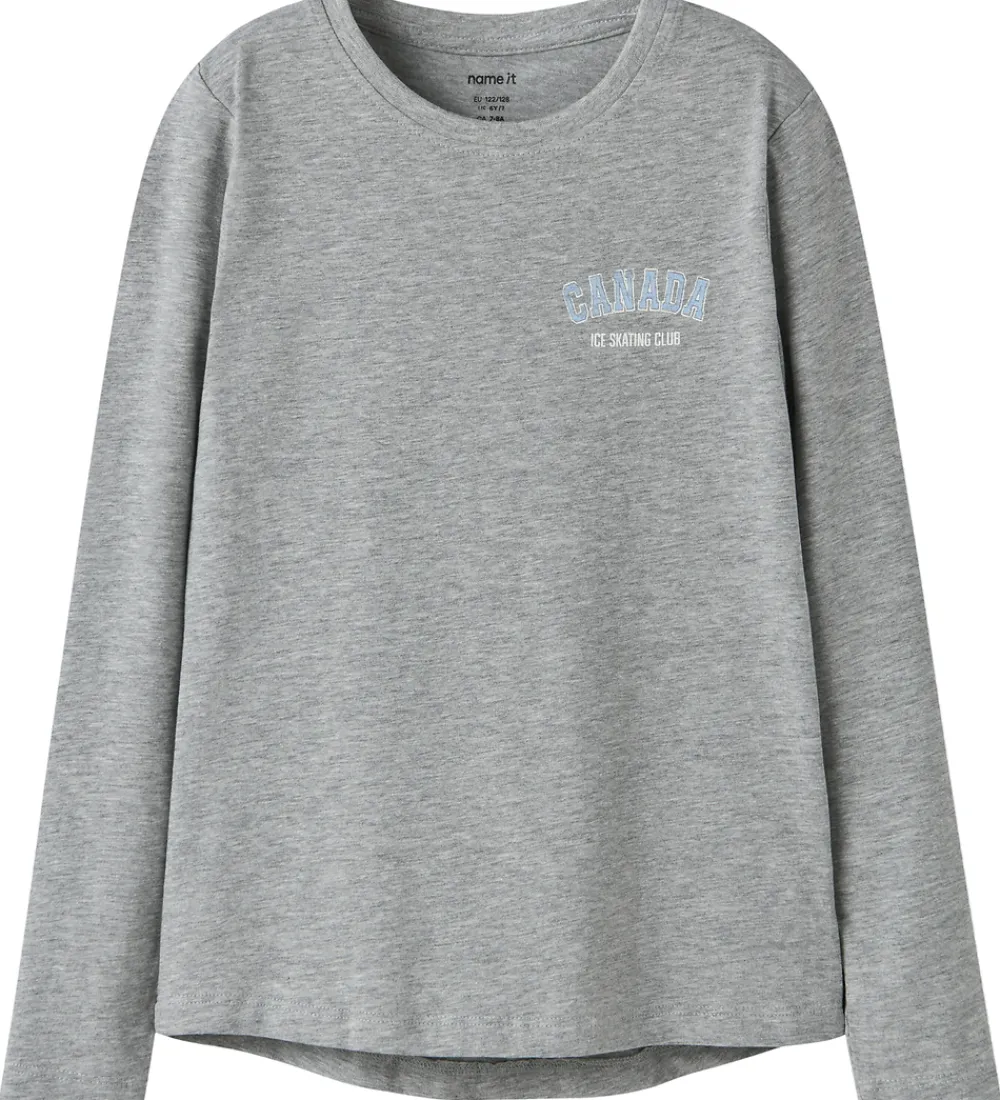 Skøn Name It bluse i gråmeleret med teksten “Canada Ice Skating Club” trykt på venstre bryst i lyseblå og hvid. Blusen har en rund halsudskæring med en smal ribkant og lange ærmer.