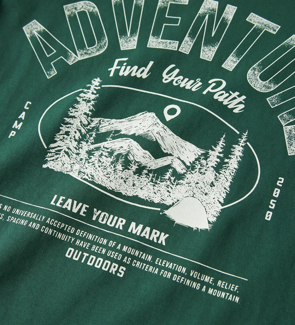 Smart Name It bluse i en dyb grøn farve med et print på forsiden med teksten “Adventure” samt illustrationer af bjerge og skove. Blusen har en rund halsudskæring med en smal ribkant og lange ærmer.