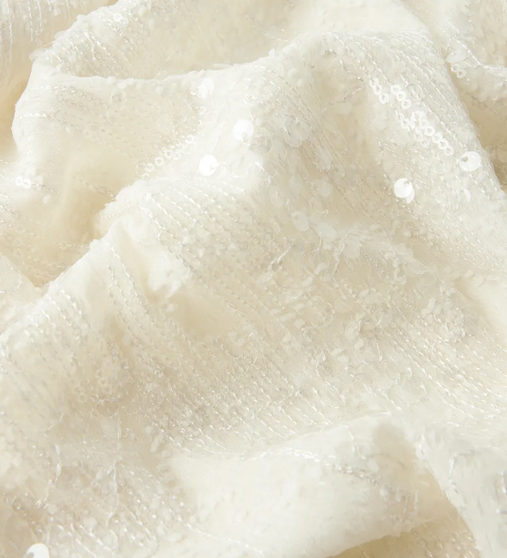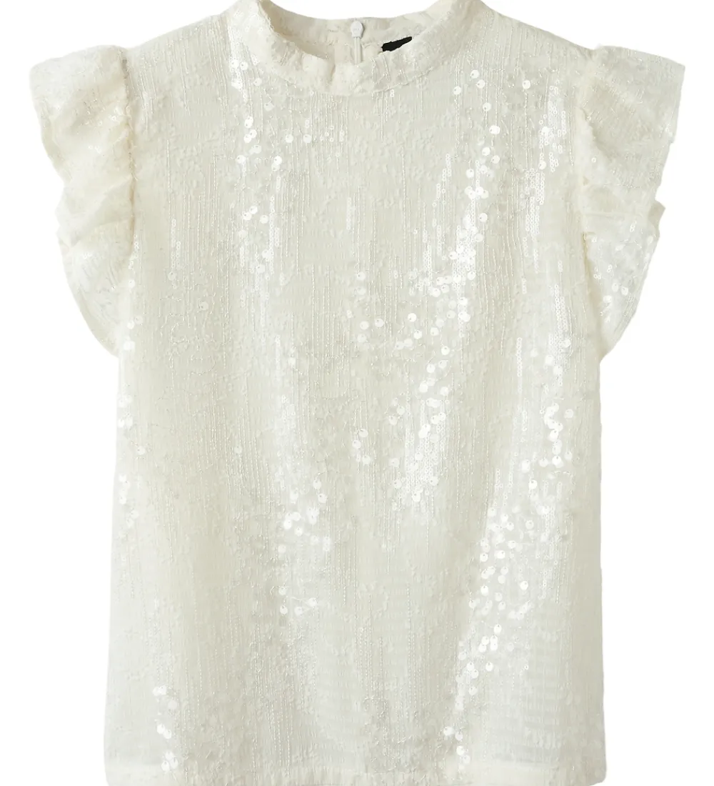Elegant LMTD bluse i hvid med broderidetaljer og transparente palietter. Blusen har en rund halsudskæring med en knap i nakken. Den har korte flæseærmer og en løs pasform.