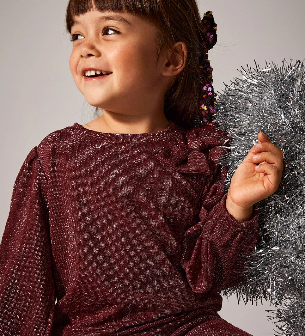 Elegant Name It bluse med lange ærmer i en dyb bordeaux nuance me glimmer. Med en rund halsudskæring og en dekorativ sløjfe på skulderen fremstår Name It blusen både stilren og fin. De bløde ærmer har elastiske kanter.