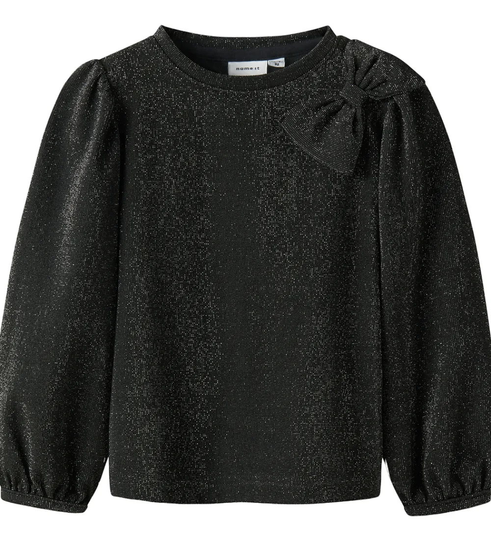 Flot Name It bluse med lange ærmer i sort med glimmer. Med en rund halsudskæring og en dekorativ sløjfe på skulderen fremstår Name It blusen både stilren og fin. De bløde ærmer har elastiske kanter.
