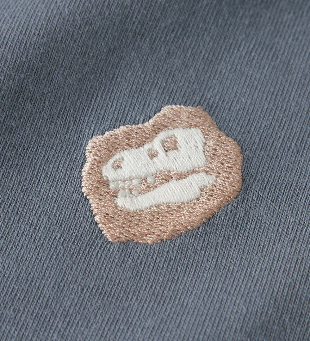 Fin Name It bluse i støvet blå med et lille, broderet dinosaurkanie på venstre bryst. Blusen har en rund halsudskæring med en smal ribkant og lange ærmer.