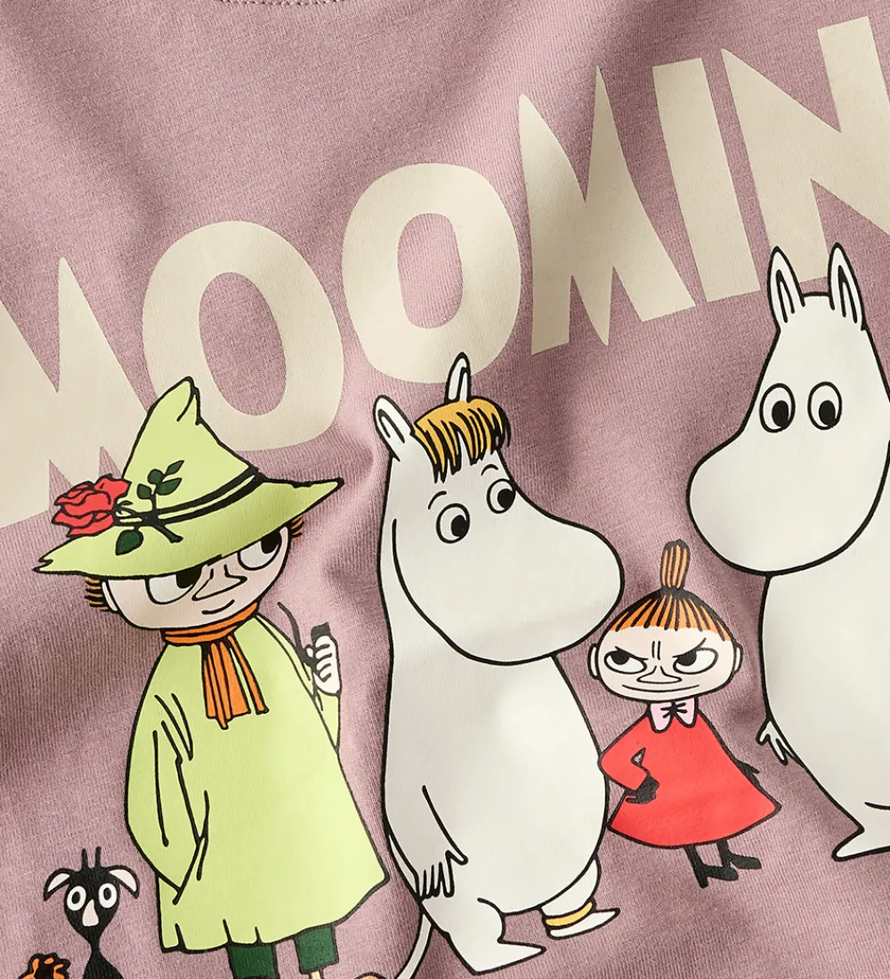 Charmerende Name It bluse i lilla med print af Mumitroldene på fronten i fine farver. Blusen har en rund halsudskæring med en smal ribkant og lange ærmer.