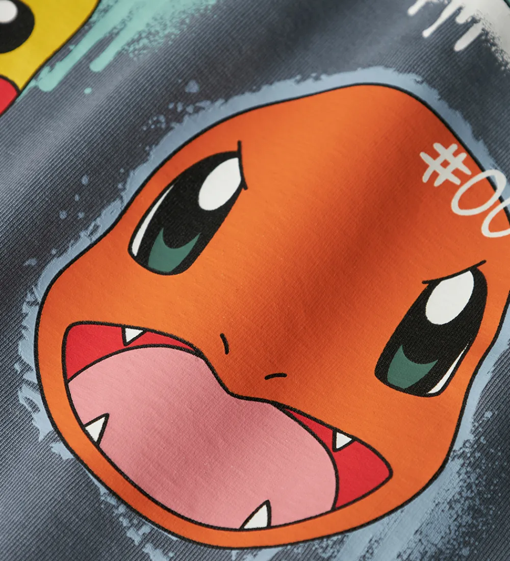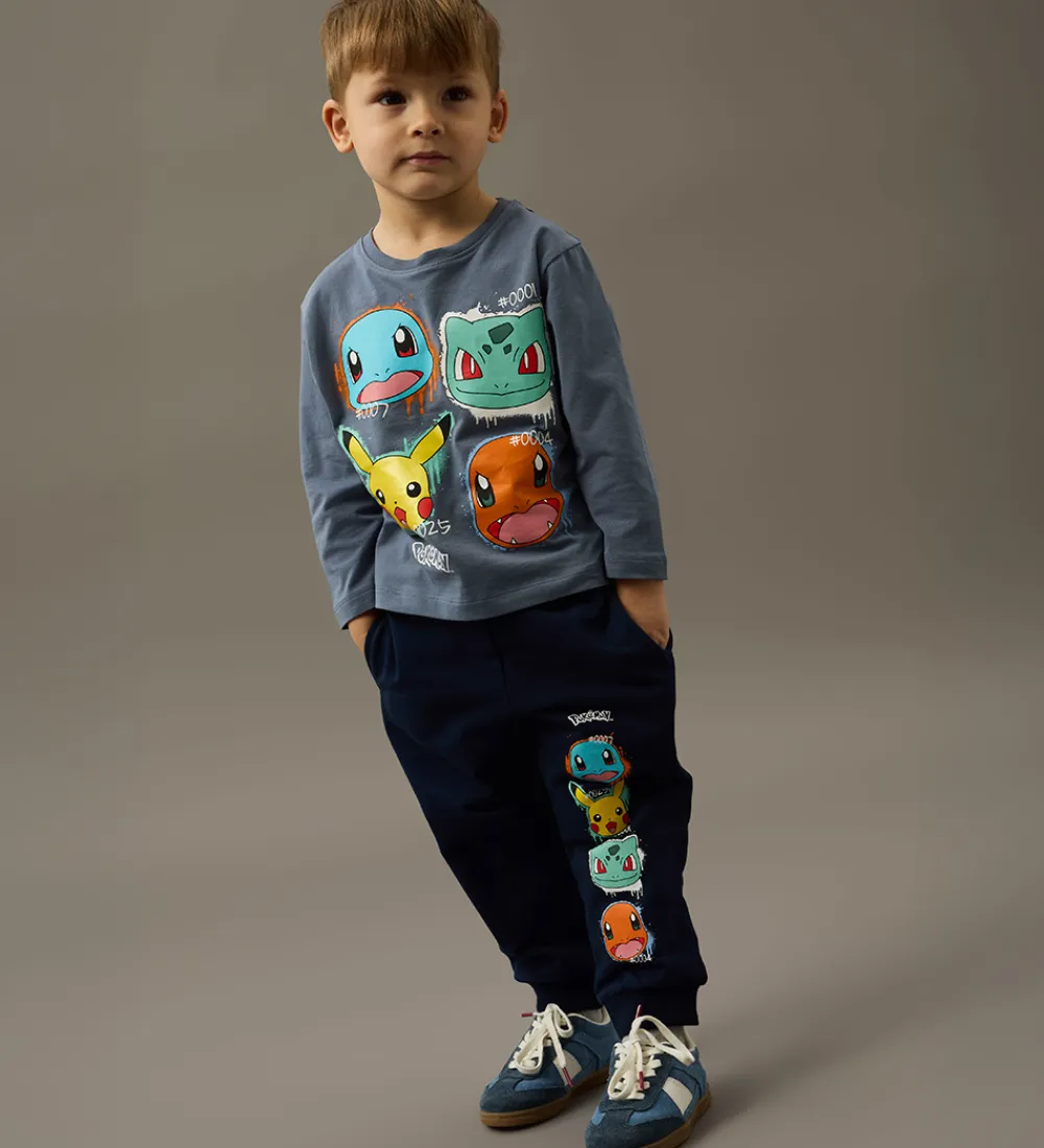 Flot Name It bluse i støvet mørkeblå med print af fire forskellige Pokémon-figurer. Blusen har en rund halsudskæring med en smal ribkant og lange ærmer.