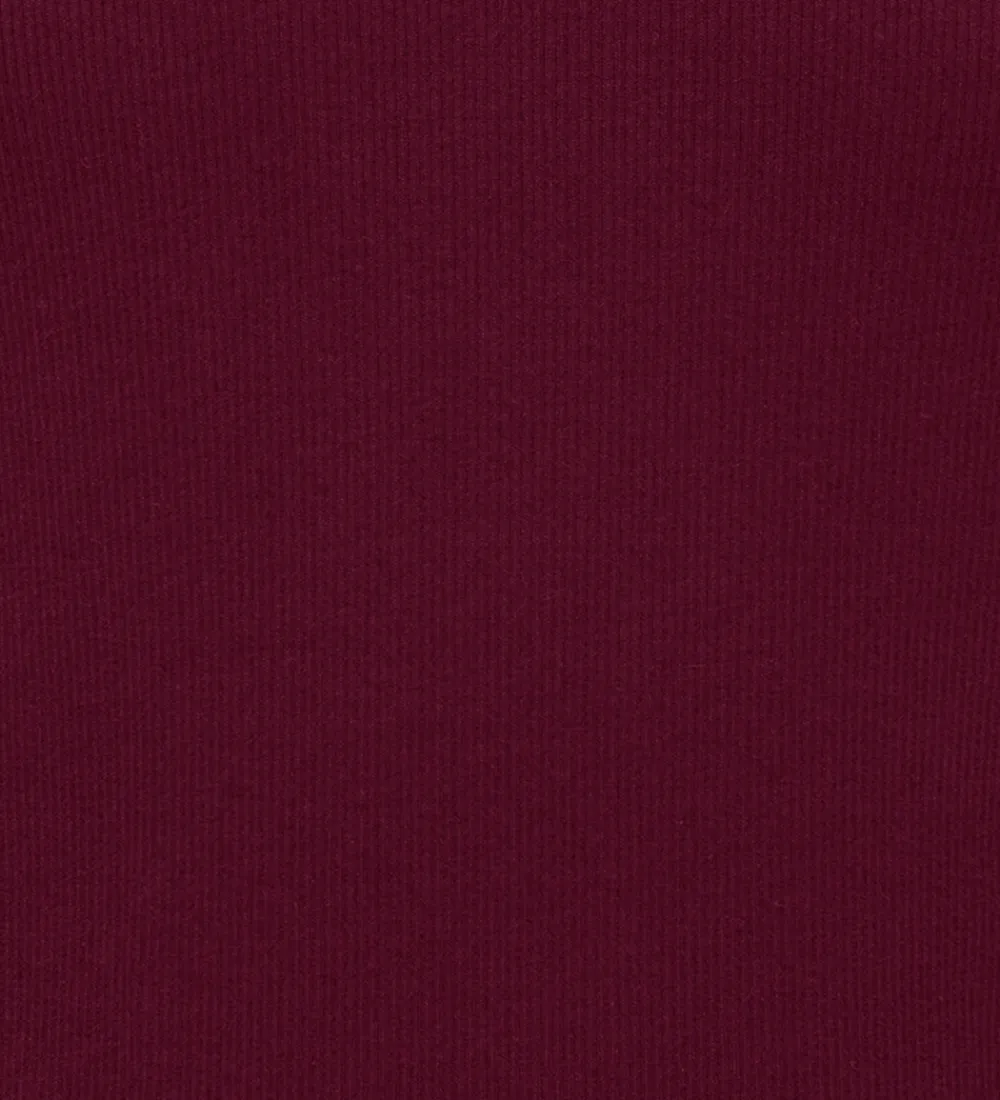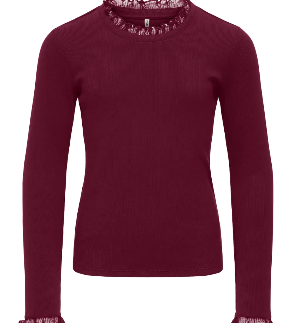 Elegant Kids Only bluse med lange ærmer i en dyb, vinrød nuance. Blusen har en rund halsudskæring med fine flæsedetaljer, der også går igen ved håndleddene. Kids Only benytter et ribbet materiale, der skaber en diskret tekstur og tilføjer et stilrent udtryk.