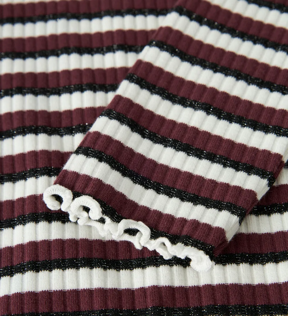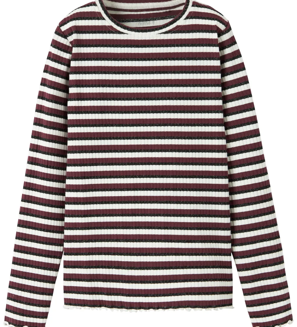 Flot Name It bluse med stribet design i mørkerød, hvid og sort med sølv glimmer. Blusen har ribstruktur og en rund halsudskæring. Den har lange ærmer og bølgede kanter i ærme- og taljeåbning.