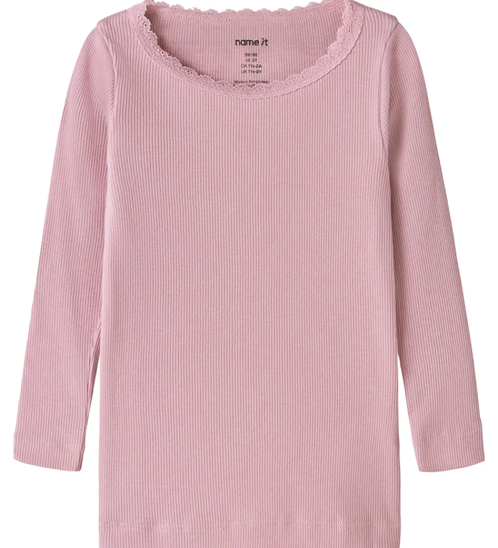 Elegant Name It bluse i rosa med ribstruktur. Blusen har en rund halsudskæring med en fin blondekant og lange ærmer.