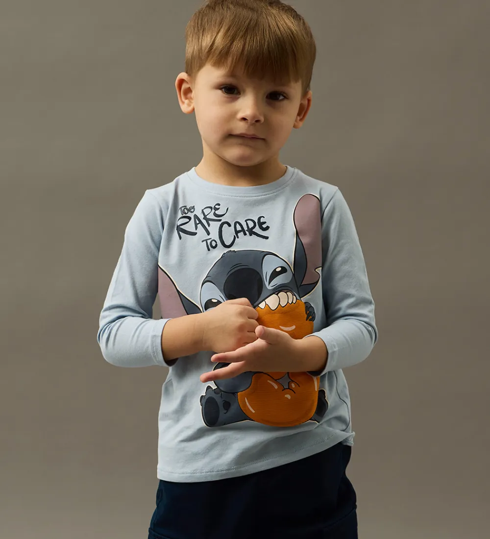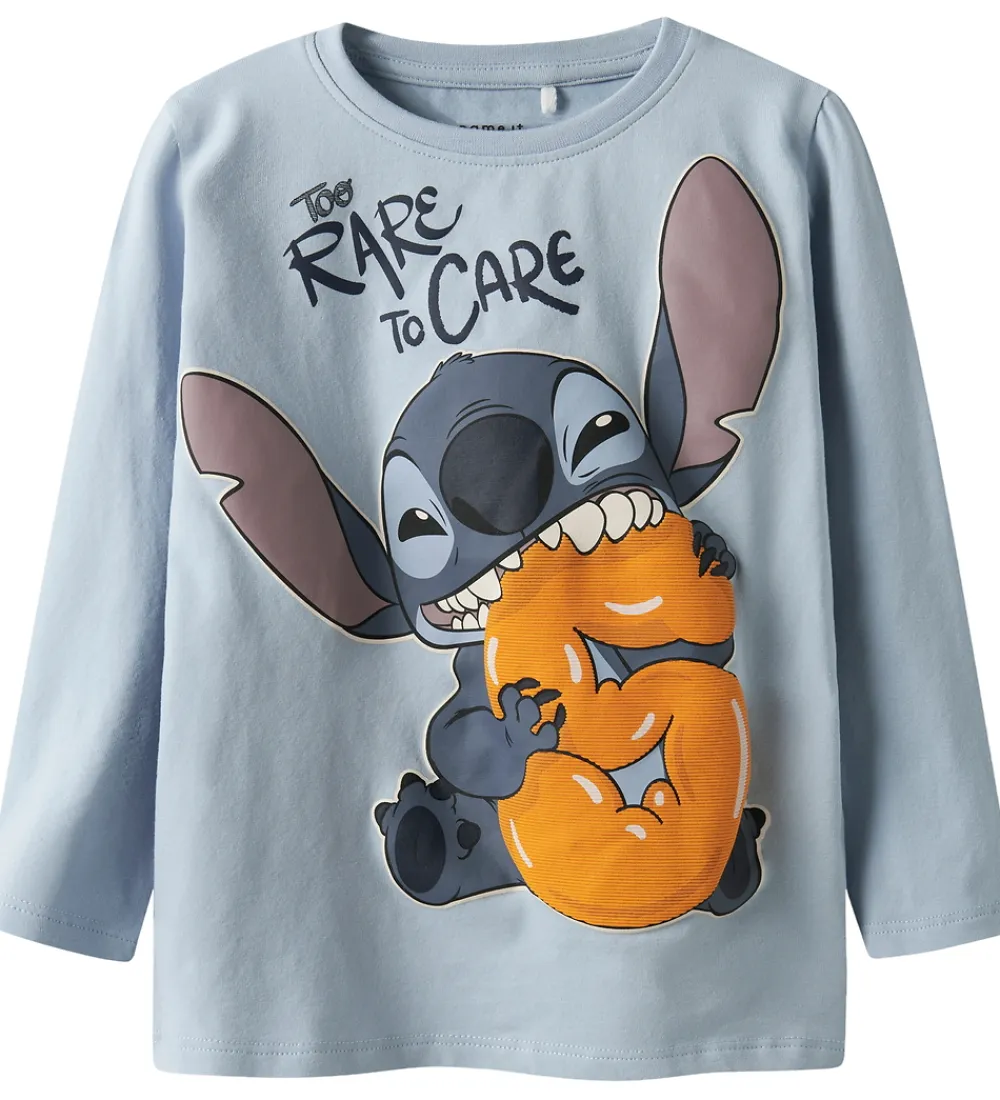Charmerende Name It bluse med lange ærmer i en lys blå nuance. Blusen er dekoreret med et stort print af Disney-figuren Stitch og teksten “Too Rare to Care”. Blusen har en rund halsudskæring med en smal ribkant.