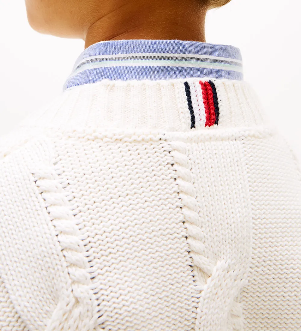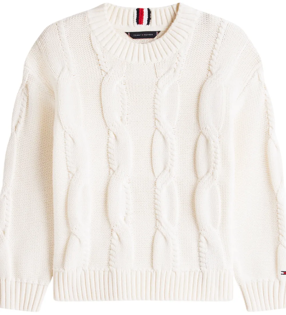 Flot Tommy Hilfiger strik i hvid med et klassisk kabelstrikket mønster. Blusen har en rund halsudskæring og lange ærmer med brede ribkanter ved alle åbninger.