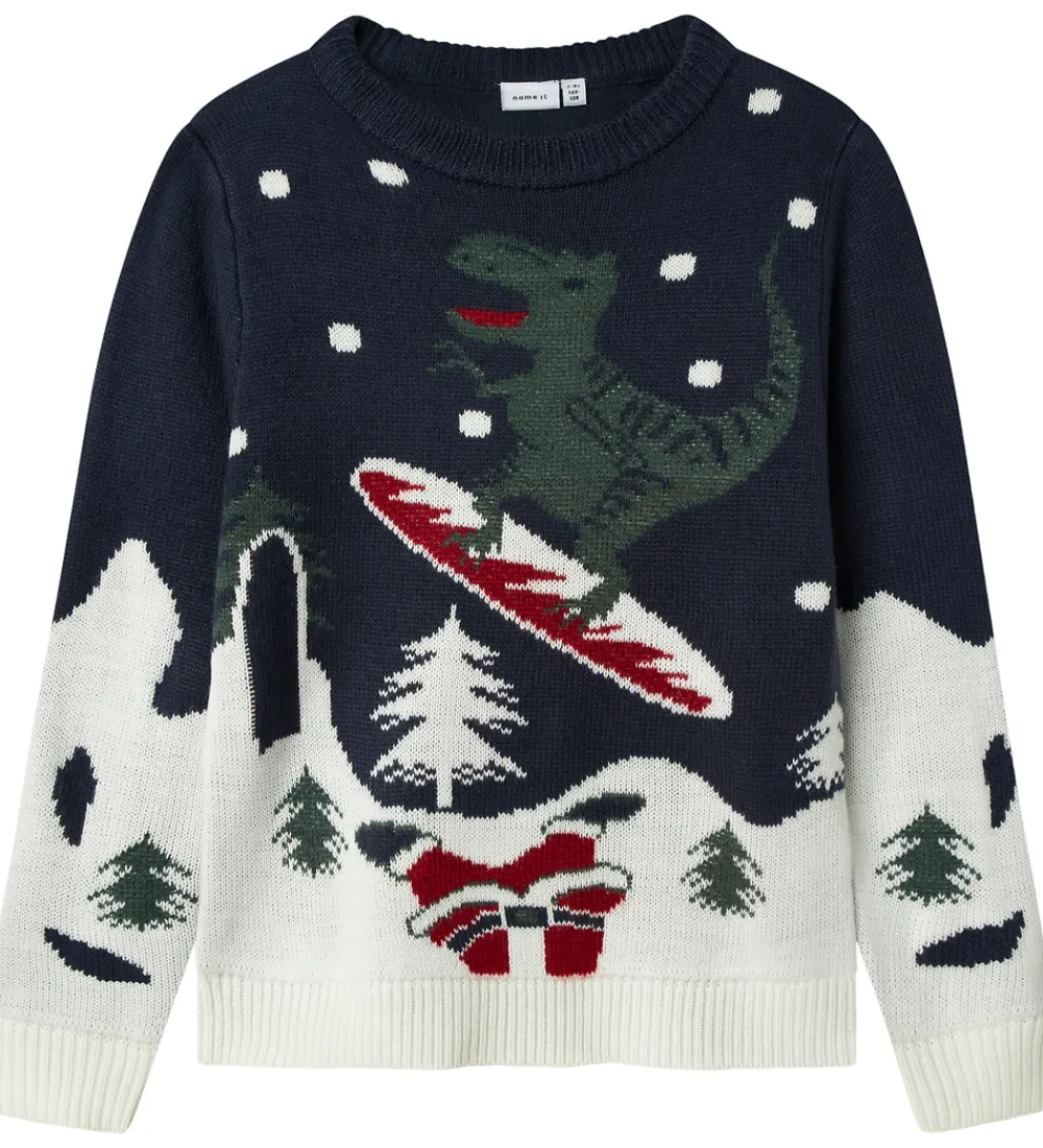 Sjov Name It bluse i navyblå med et stort snelandskab på fronten og en dinosaur på snowboard. Blusen har en strikket struktur med lange ærmer og ribkanter.