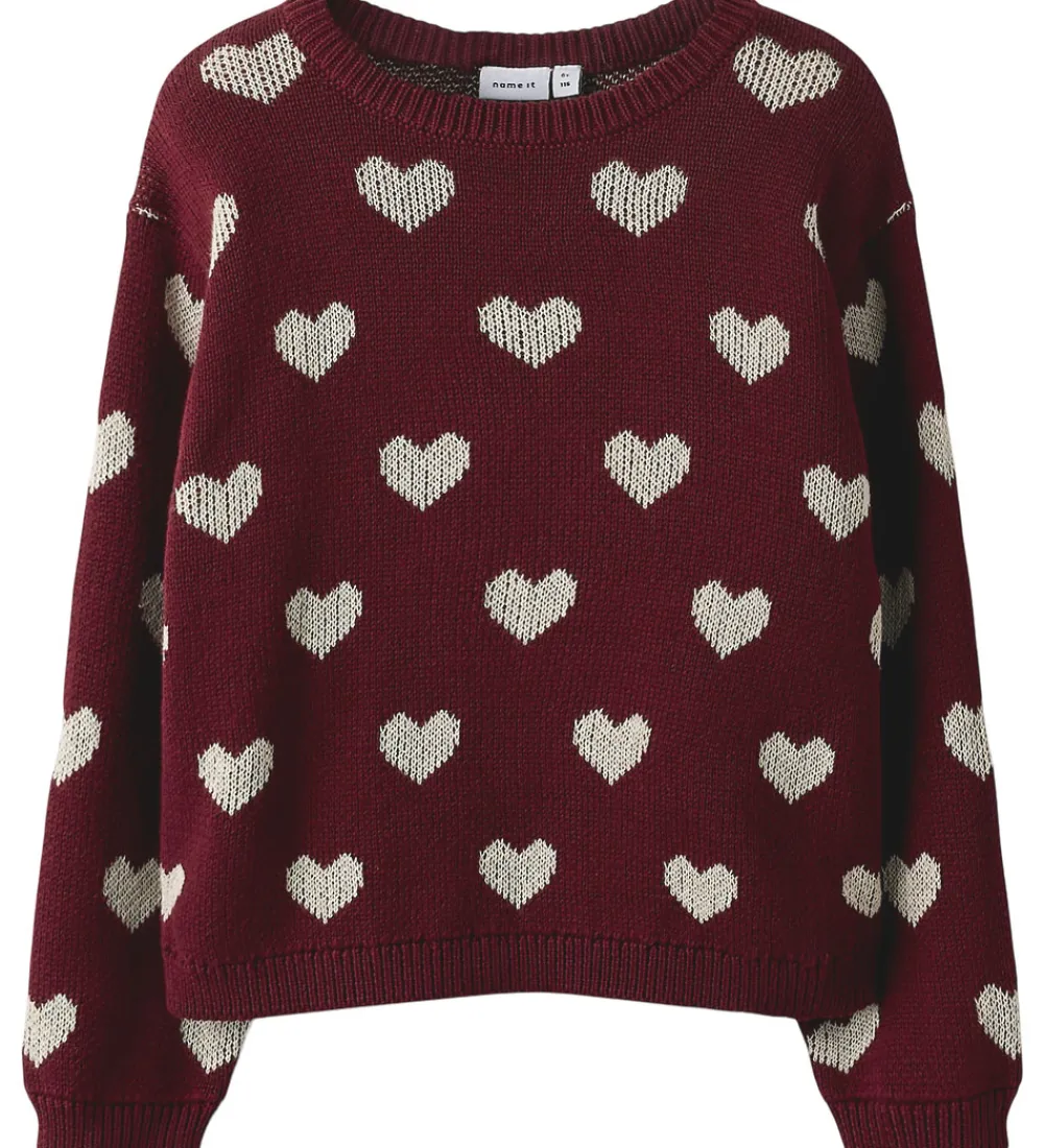 Charmerende Name It bluse i mørkerød med et fint mønster af hvide hjerter. Blusen har strikket struktur, og er designet med lange ærmer og en rund halsudskæring.