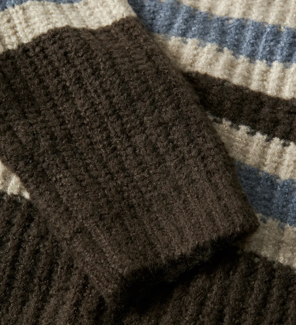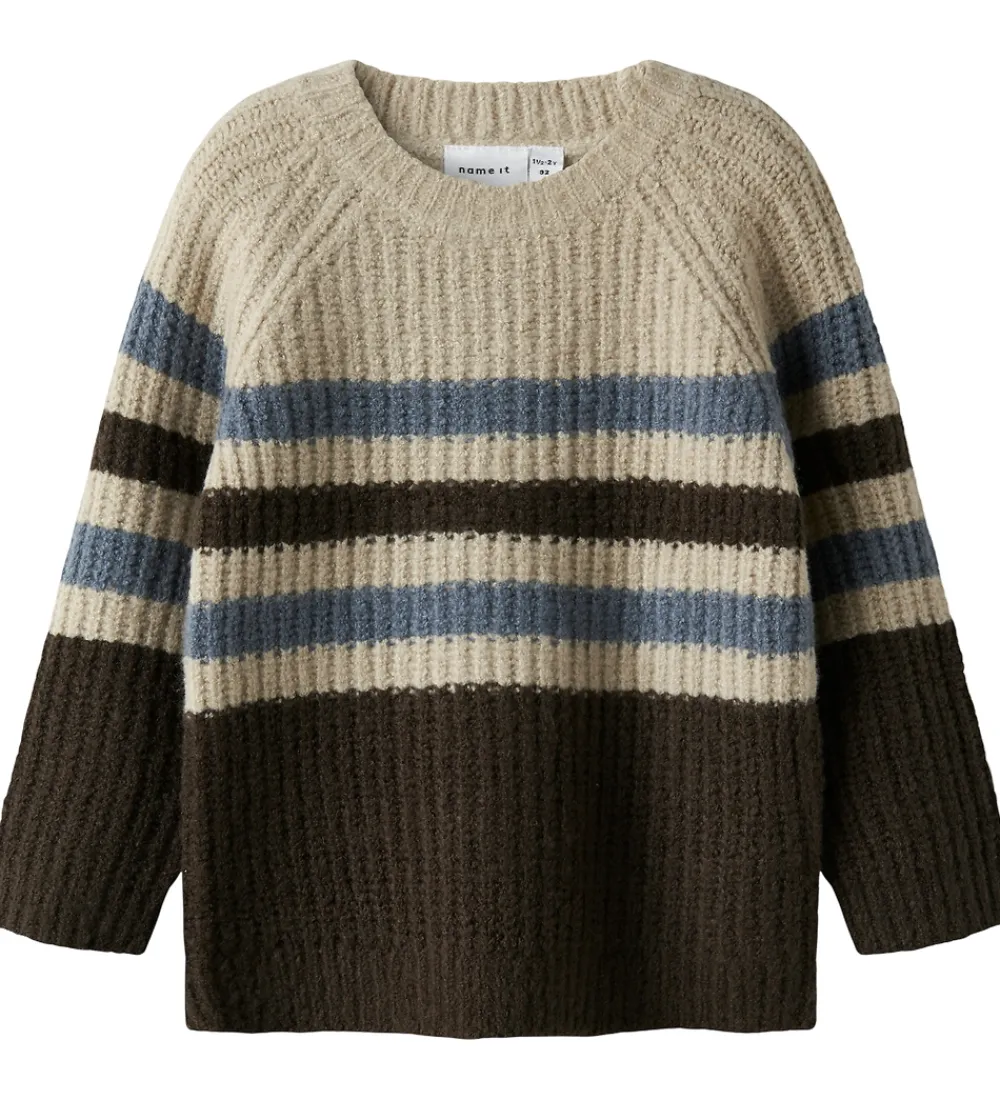 Flot Name It bluse i et stribet mønster i beige, blå og mørkebrun. Blusen har en strikket struktur med en rund halsudskæring og lange ærmer med ribkanter.