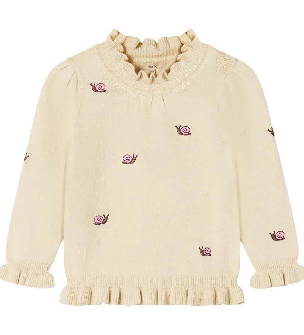 Charmerende Fliink bluse i lys beige strik med små, broderede snegle i brun og rosa. Blusen har en mellemhøj hals med flæsekant. Den har lange ærmer med rynker ved skuldrene og flæseafslutning i ærme- og taljeåbning.