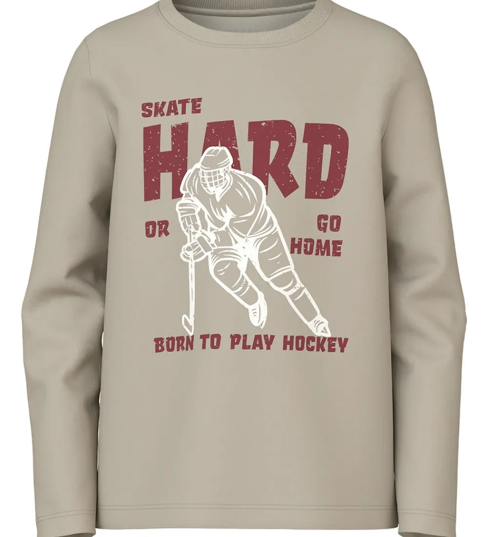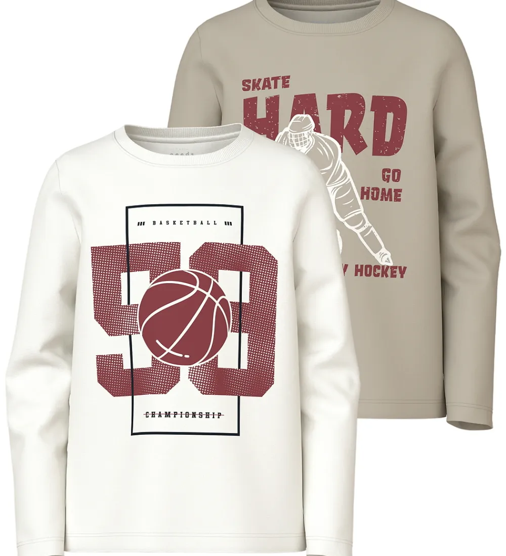 Sporty Name It bluser i en pakke med to forskellige designs. Den ene bluse er i hvid med et stort print af tallet “98” og en basketball. Den anden bluse er beige med et print af en ishockeyspiller og teksten “Skate Hard, Go Home, Play Hockey.”