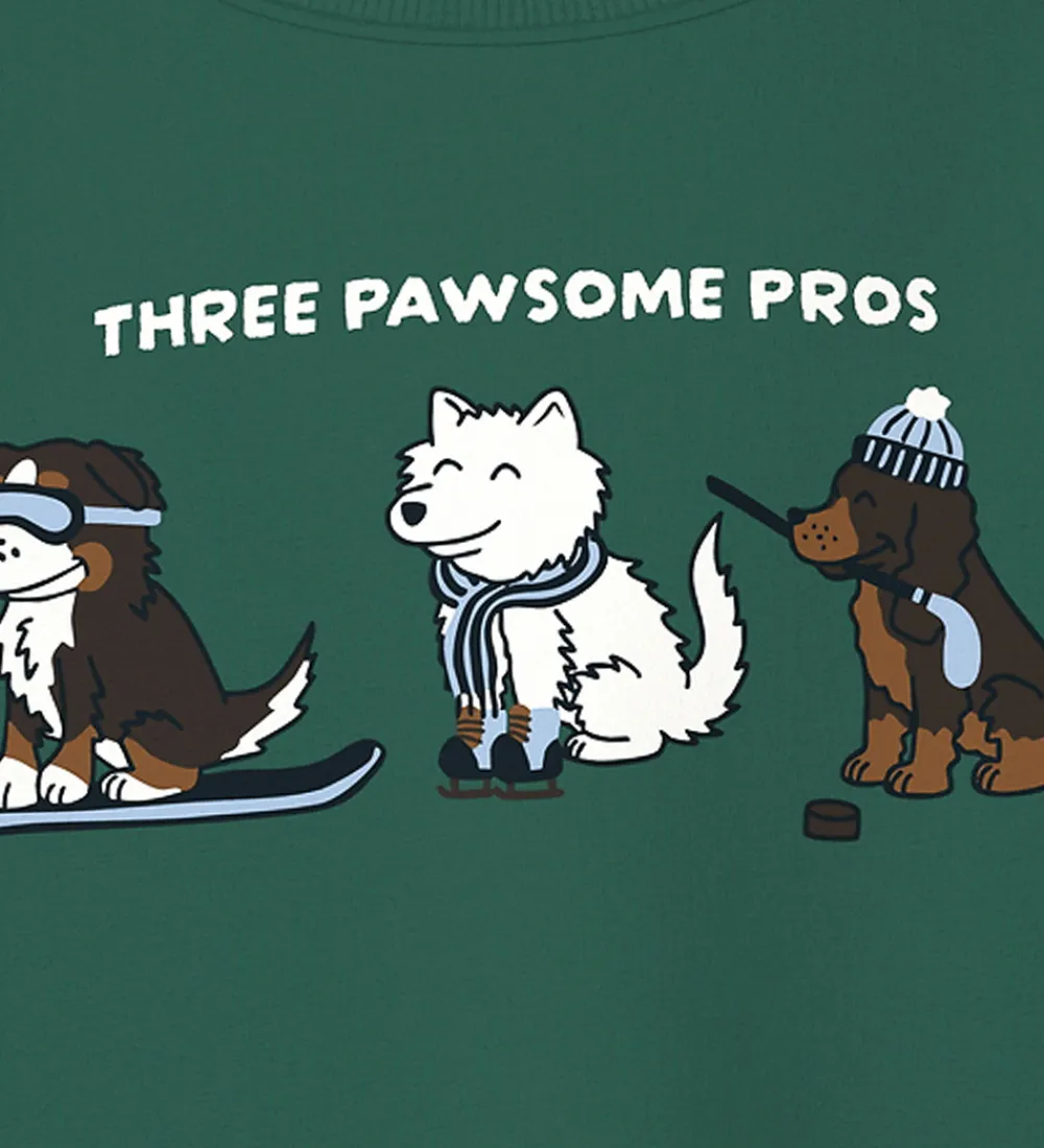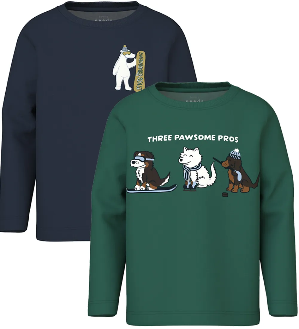Den ene bluse har en dyb marineblå farve med et motiv af en isbjørn og teksten “Stay Cool”. Den anden har en grøn nuance med print af tre hunde, der bærer vintertilbehør, og teksten “Three Pawsome Pros”. Begge bluser har rund halsudskæring.