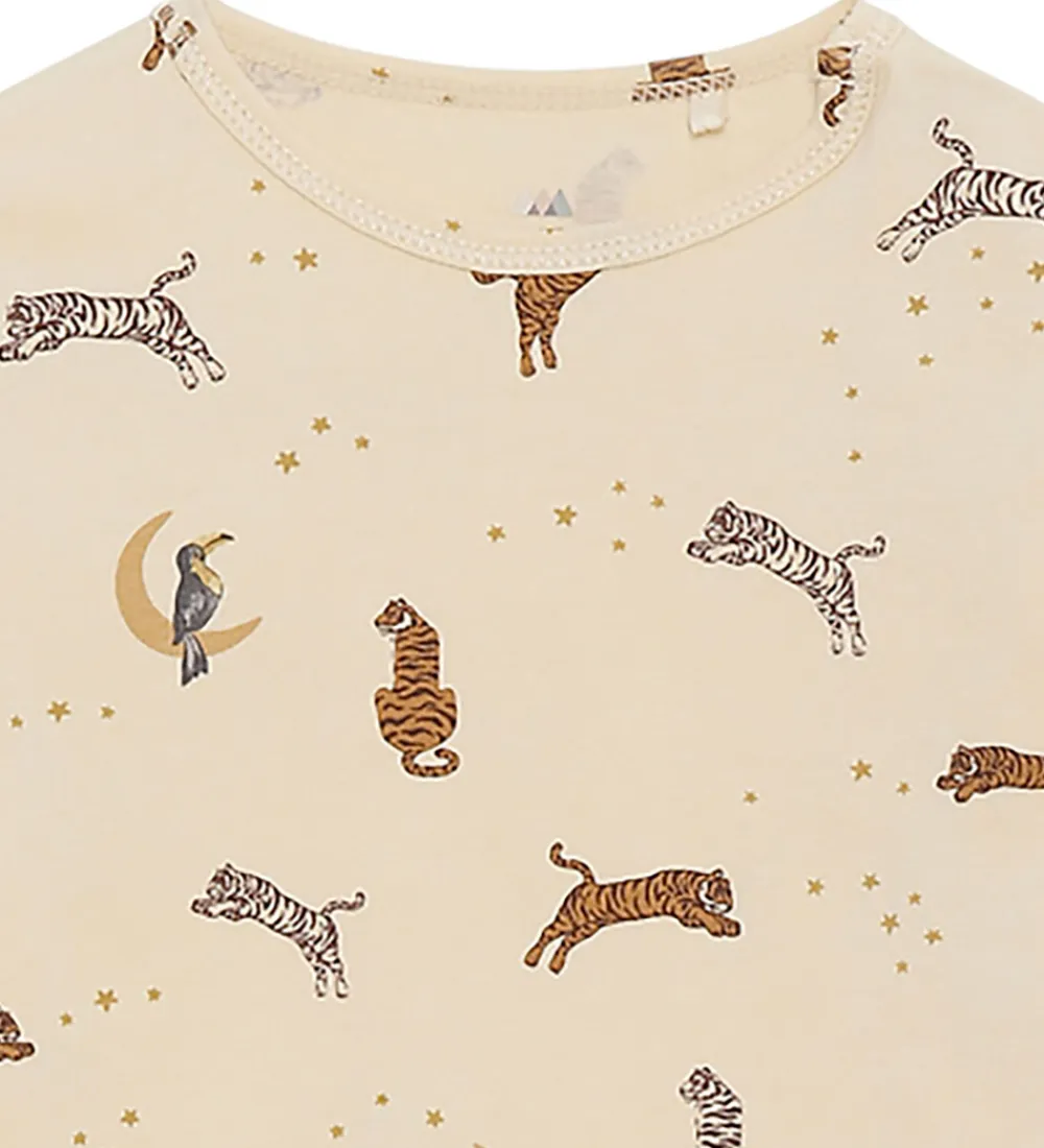 Fin Konges Sløjd body med lange ærmer i en blød, cremefarvet nuance med et fantasifuldt mønster med forskellige tigerdyr i brune og sorte nuancer samt små stjerner og måner.