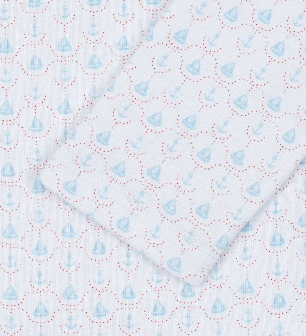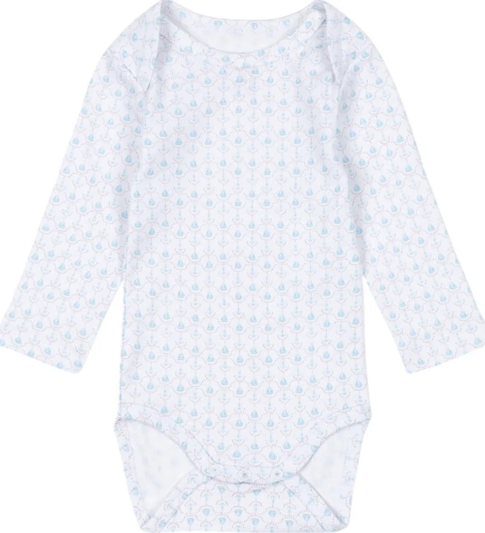 Fin Fanga Fontana body i hvid med lange ærmer og et delikat mønster af små, lyseblå skibe og røde prikker.