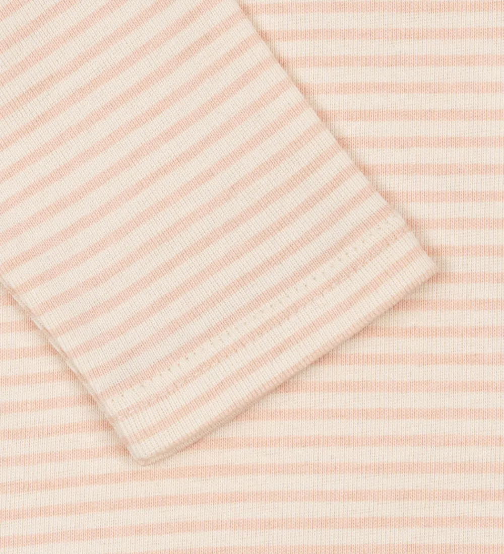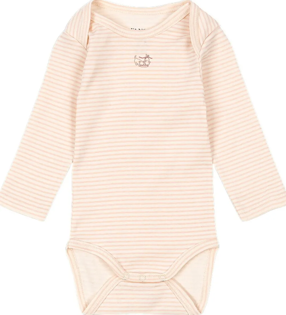 Elegant Fanga Fontana body med lange ærmer og et klassisk, stribet mønster i en sart rosa og cremehvid nuance. Det lille print på brystet tilføjer et enkelt dekorativt element. Bodyen lukkes nederst med praktiske trykknapper.