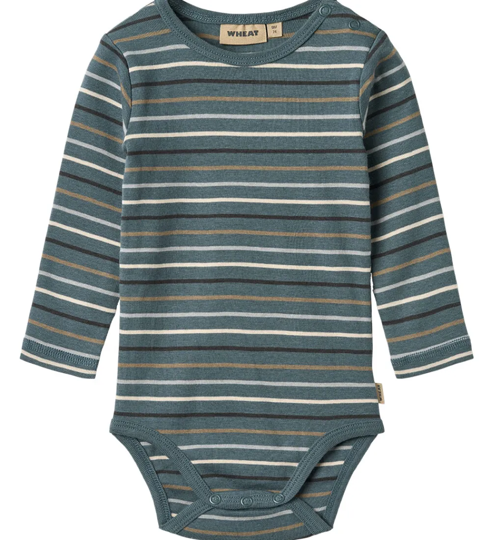 Charmerende Wheat body i støvet blå med smalle striber i nuancer af blå, brun og hvid. Wheat bodyen lukkes nemt med trykknapper nederst og over venstre skulder, hvilket gør det praktisk ved påklædning.
