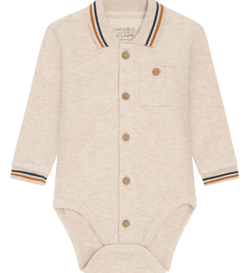 Charmerende Hust and Claire body med lange ærmer, præsenteret i en blød beige nuance. Bodyen har en ribbet struktur og fine detaljer som stribede kanter i kraven og ved håndleddene i kontrastfarver. Hust and Claire har forsynet bodyen med knaplukning foran samt en lille lomme på brystet.