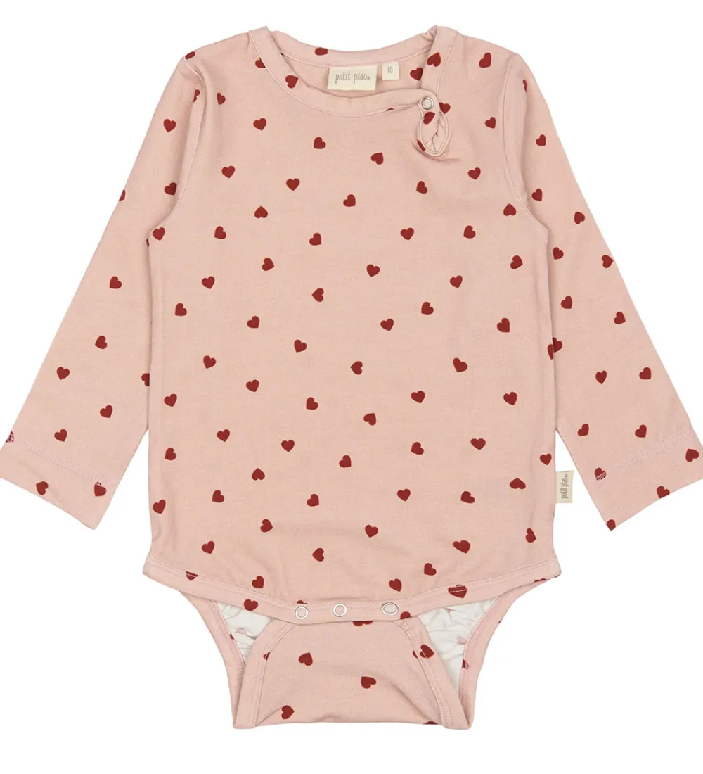 Charmerende Petit Piao body med lange ærmer i en sart, rosa farve dekoreret med små, røde hjerter. Bodyen har en enkel rund halsudskæring og delikate, flade kanter, der giver et pænt finish.