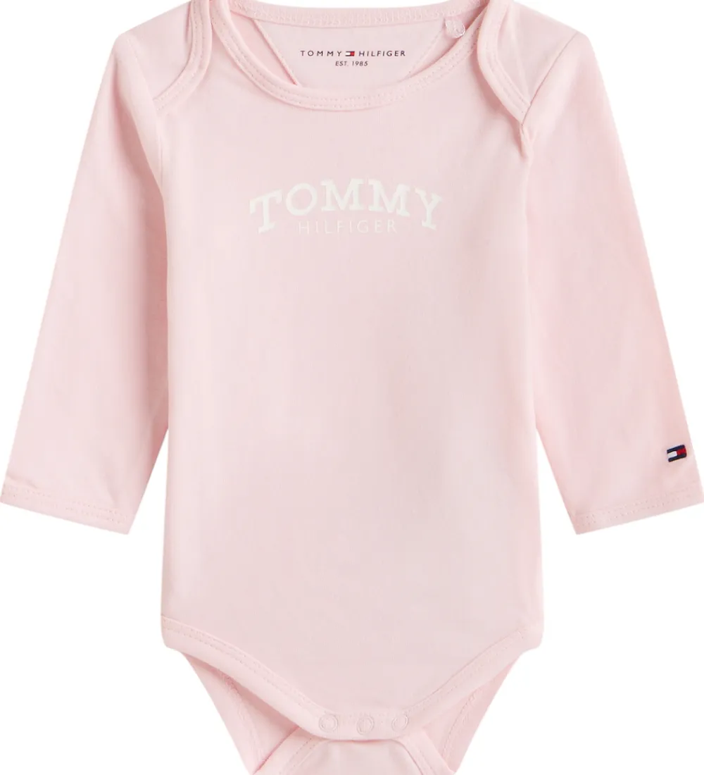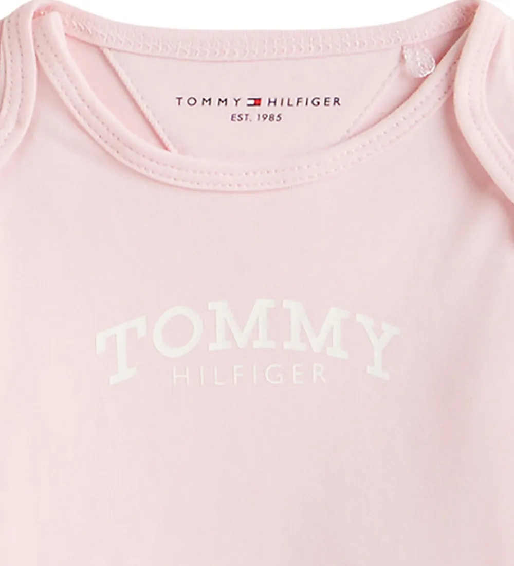 Elegant Tommy Hilfiger body i en blød rosa nuance. Den har et enkelt TOMMY HILFIGER print på brystet, der tilføjer et klassisk touch. Bodyen har en tætsiddende pasform med ribkanter ved hals og ærmer. Den har prakiske foldeskuldre og lukkes nemt med tre trykknapper i bunden for praktisk påklædning. Tommy Hilfiger logo synligt på venstre ærme.