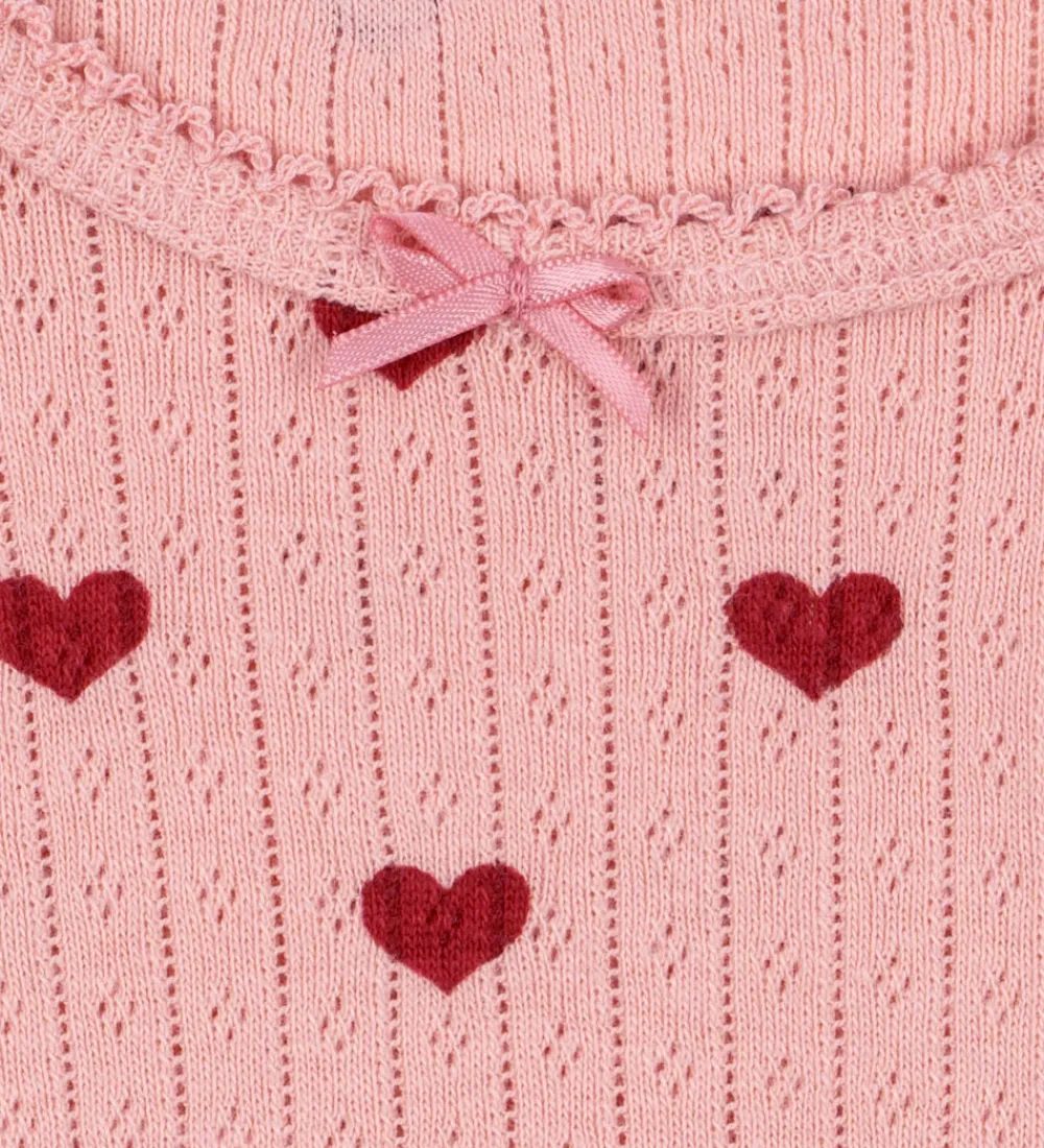 Sød body fra Konges Sløjd i rosa med røde hjerter og med et flot hulmønster. Konges Sløjd bodyen har lange ærmer, og den har fine blondekanter. Bodyen åbnes ved den venstre skulder med trykknapper, og mellem benene er der tre trykknapper.