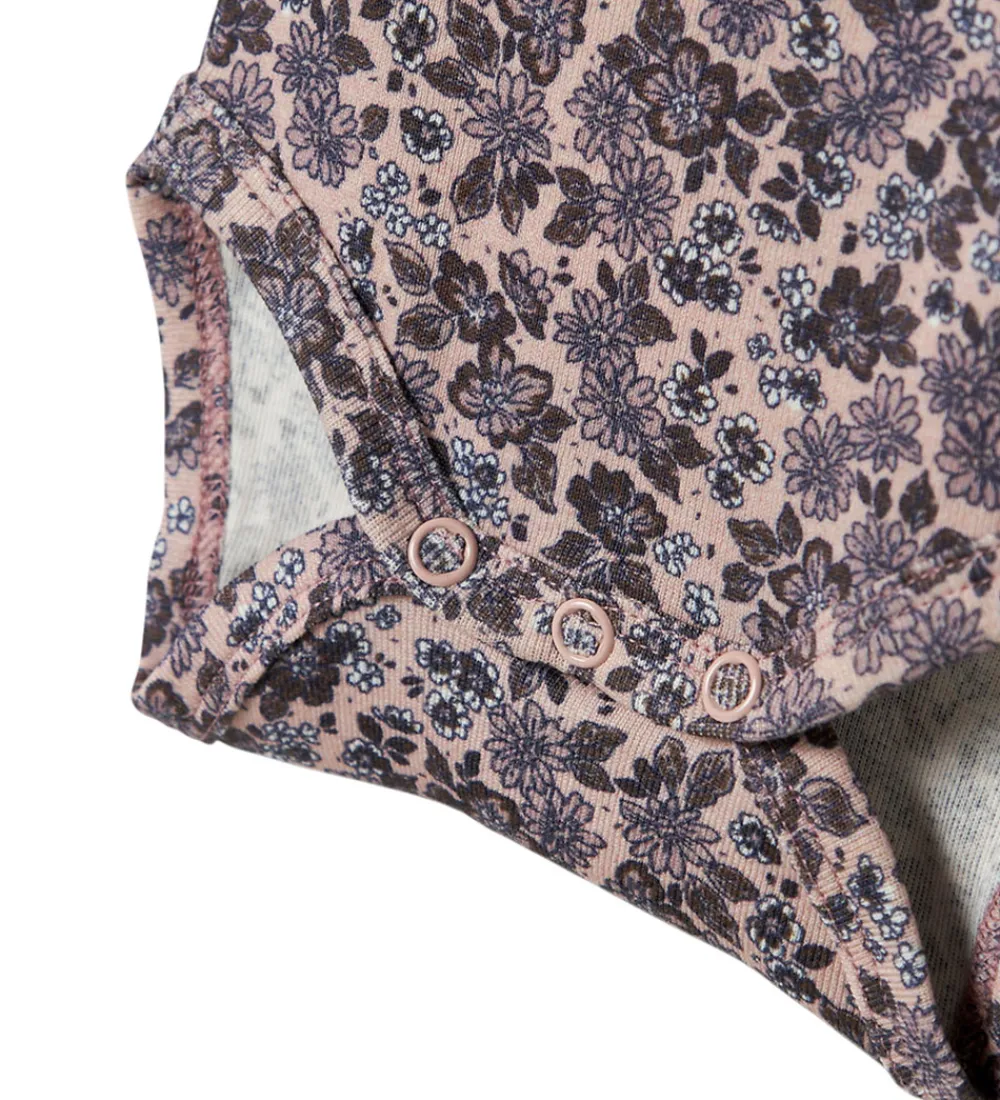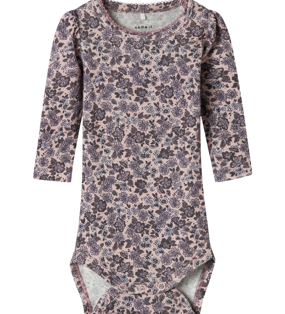 Elegant Name It body i rosa med med et delikat blomsterprint i lilla nuancer. Bodyen har lange ærmer, der giver en tæt pasform, og en rund halsudskæring med fine kantdetaljer. Den lukkes praktisk med trykknapper i bunden, hvilket sikrer nem påklædning. Name It tilbyder en stilfuld løsning til enhver garderobe.