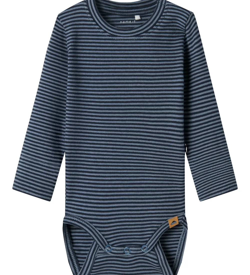 Flot Name It body med et tidløst stribet mønster i navy og støvet blå, samt en fin ribstruktur. Bodyen har ekstra lange ærmer, som kan gives et ombuk hvis det ønskes. Name It bodyen åbnes med trykknapper ved venstre skulder samt mellem benene.