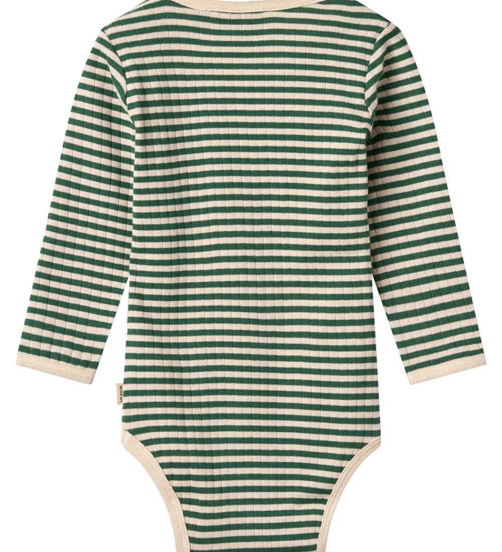 Flot Wheat body i et klassisk stribet mønster i grøn og lys beige. Wheat bodyen er lavet i en ribbet struktur, som tilfører et stilrent design. Over venstre skulder har bodyen en praktisk åbning med trykknapper.