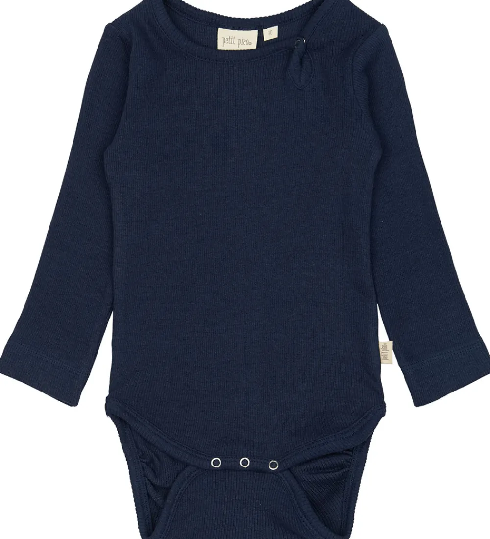 Elegant Petit Piao body med lange ærmer i en dyb blå farve. Bodyen har en fin ribstruktur, der tilfører et stilfuldt udtryk. Petit Piao har designet den med en rund halsudskæring, som bidrager til et klassisk look.