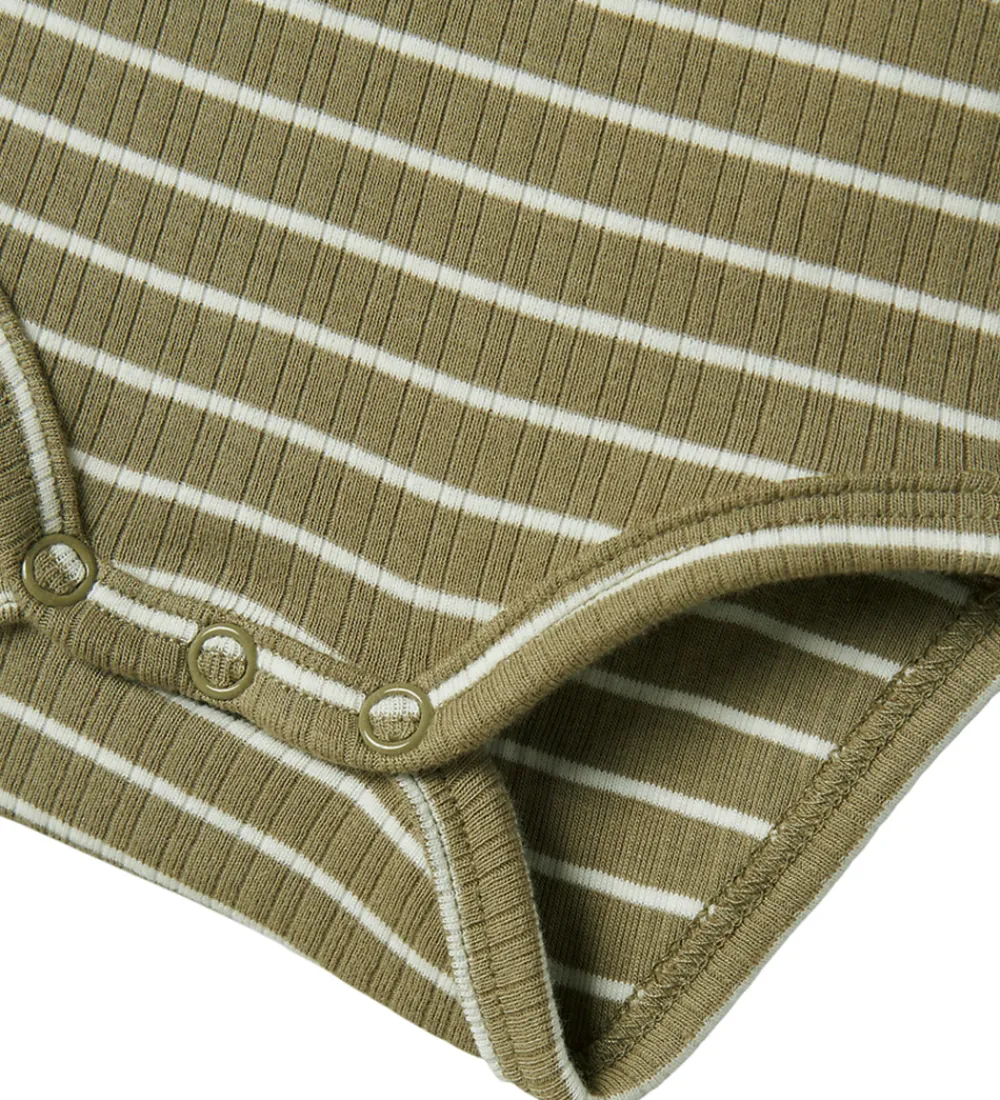 Flot Name It body i støvet grøn med hvide striber og fin ribstruktur. Bodyen har en rund halsudskæring og lange ærmer. Den lukkes med trykknapper ved venstre skulder og mellem benene.
