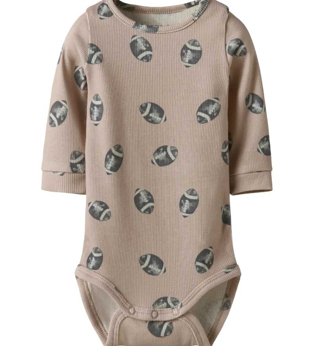 Flot Name It body i beige med et alloverprint af amerikanske fodbolde. Bodyen har diskret ribstruktur og lange ærmer. Den lukkes med trykknapper ved venstre skulder samt mellem benene.