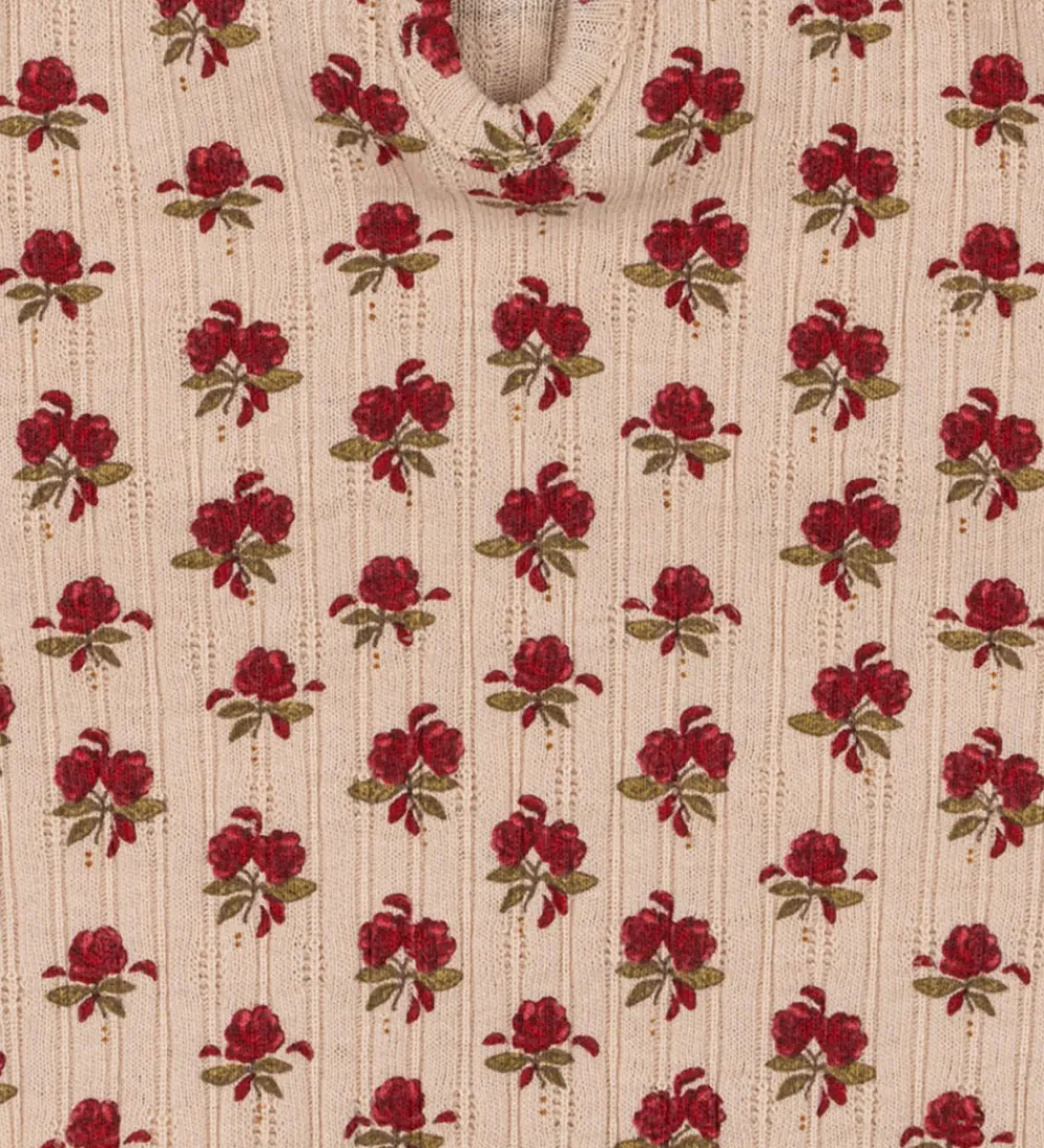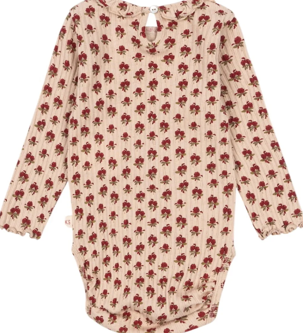 Elegant Konges Sløjd body med lange ærmer i en rosabeige nuance, prydet med et delikat blomsterprint i røde nuancer. Bodyen har en lækker ribstruktur og et diskret hulmønster.