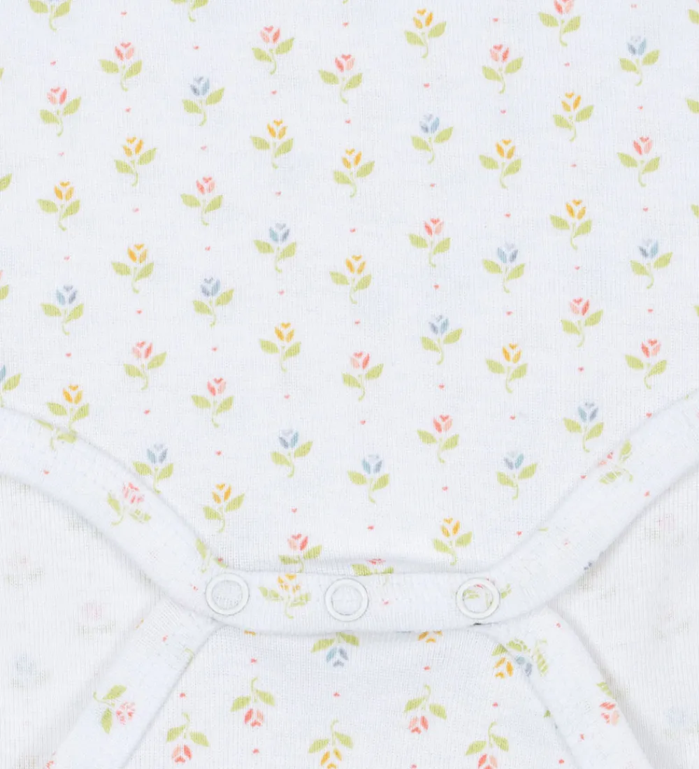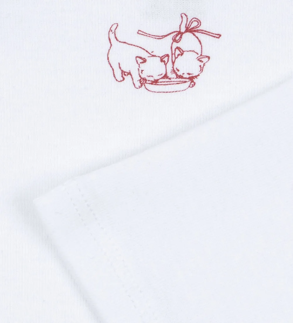 Charmerende Fanga Fontana bodyer med lange ærmer solgt i en 3-pak. To i hvid med et lille katteprint på brystet, og en i hvid med et farverigt blomsterprint.
