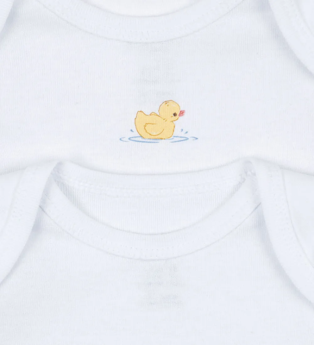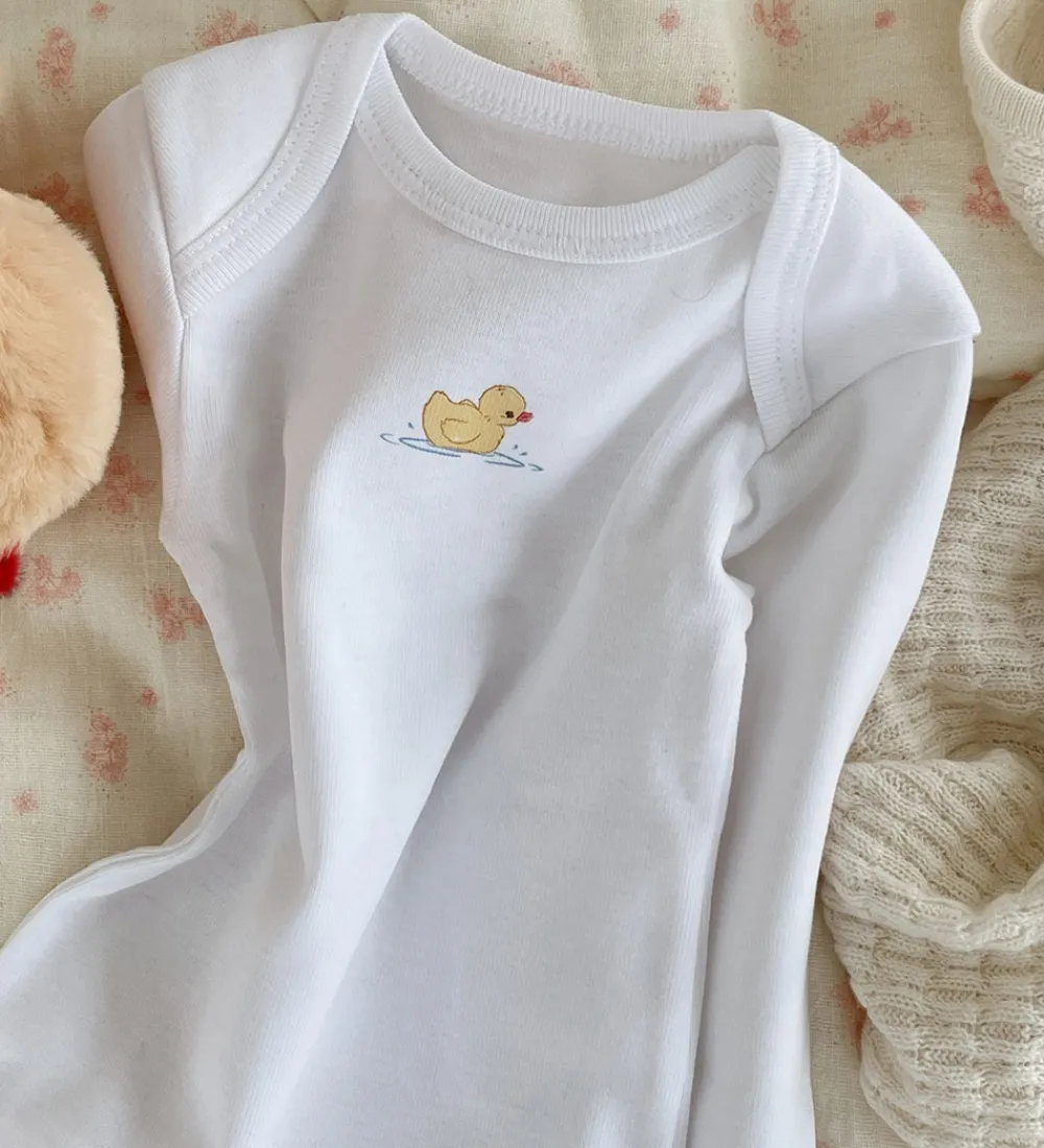 Fine Fanga Fontana bodyer solgt i en 2-pak. Den ene body er ensfarvet hvid, mens den anden har et sødt print med en lille, gul and på forsiden. Fanga Fontana bodyerne har lange ærmer og en rund halsudskæring.