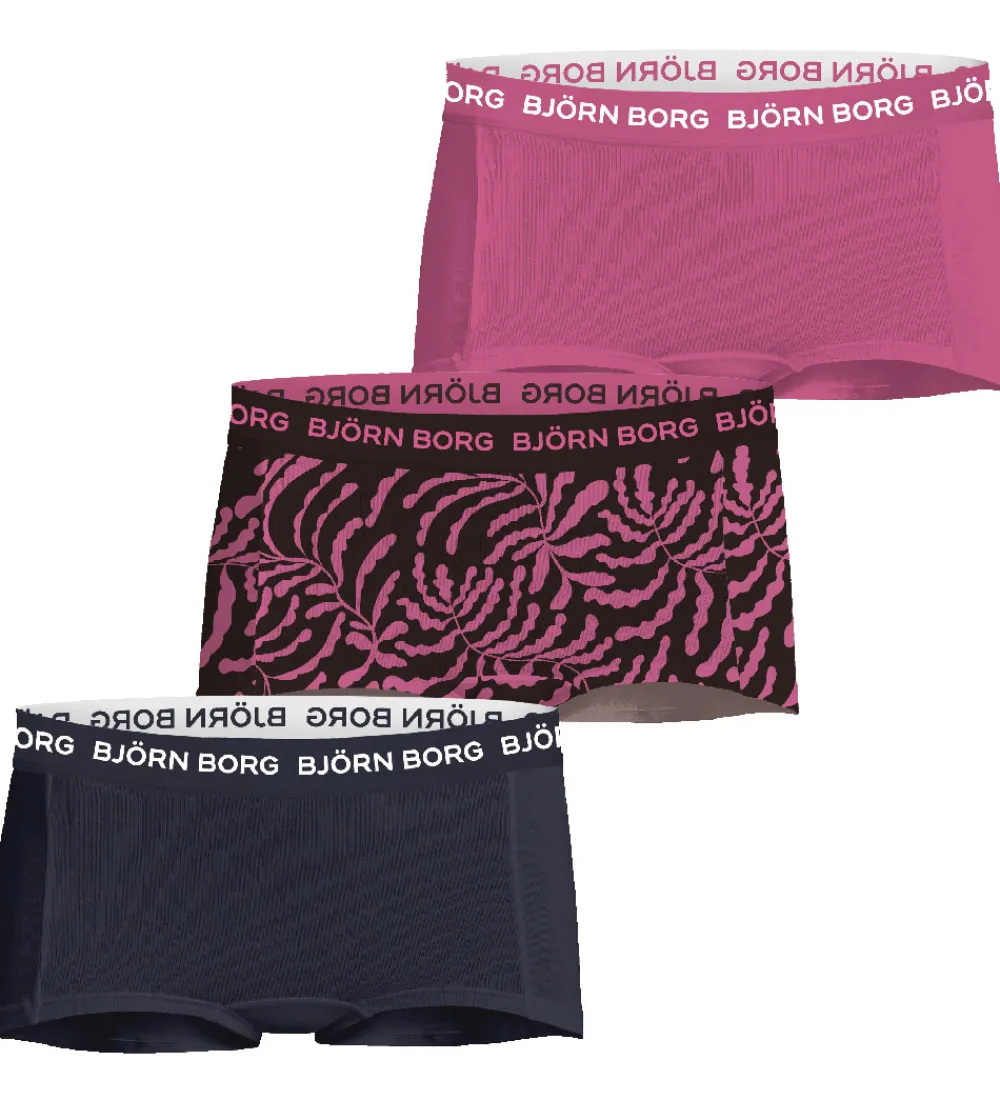 Flotte Björn Borg boxershorts i en pakke med tre forskellige designs. En ensfarvet pink model, en mørk bordeaux med lyserødt bladmønster og en klassisk navy. Björn Borg boxershortsene har en elastisk linning med logo, som sikrer en god pasform. De er lavet af et blødt materiale og giver en behagelig oplevelse ved brug.