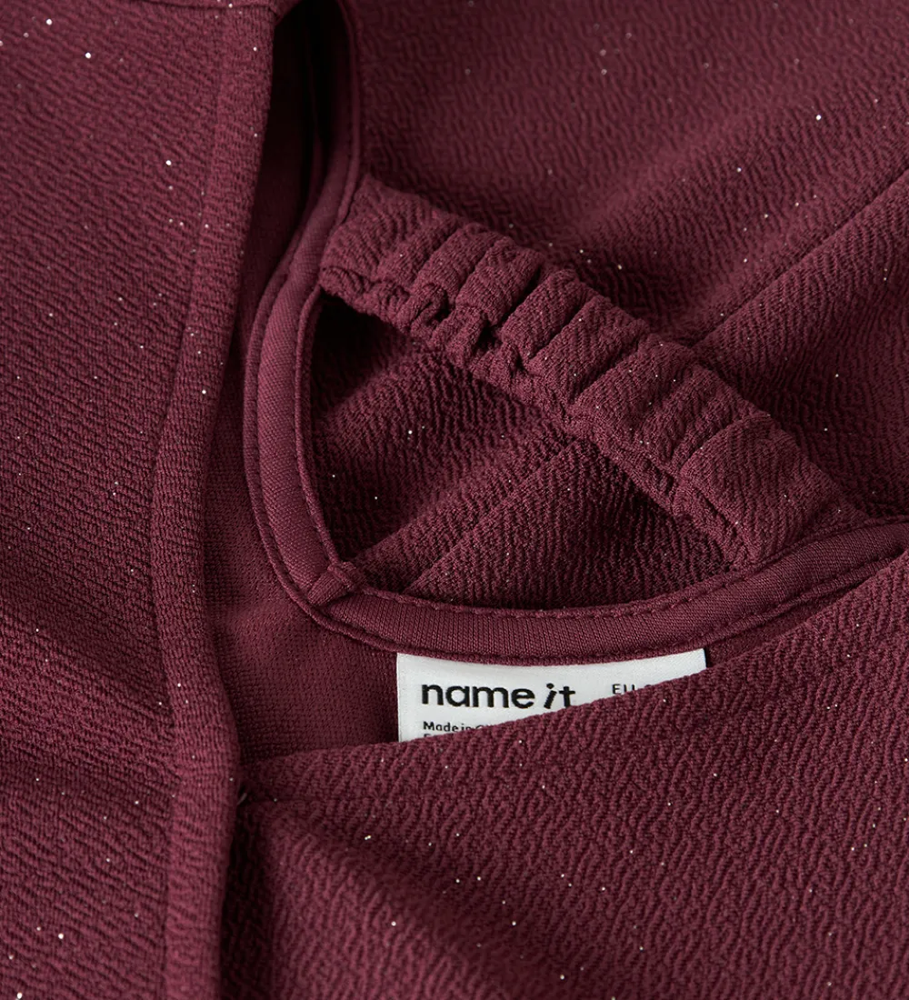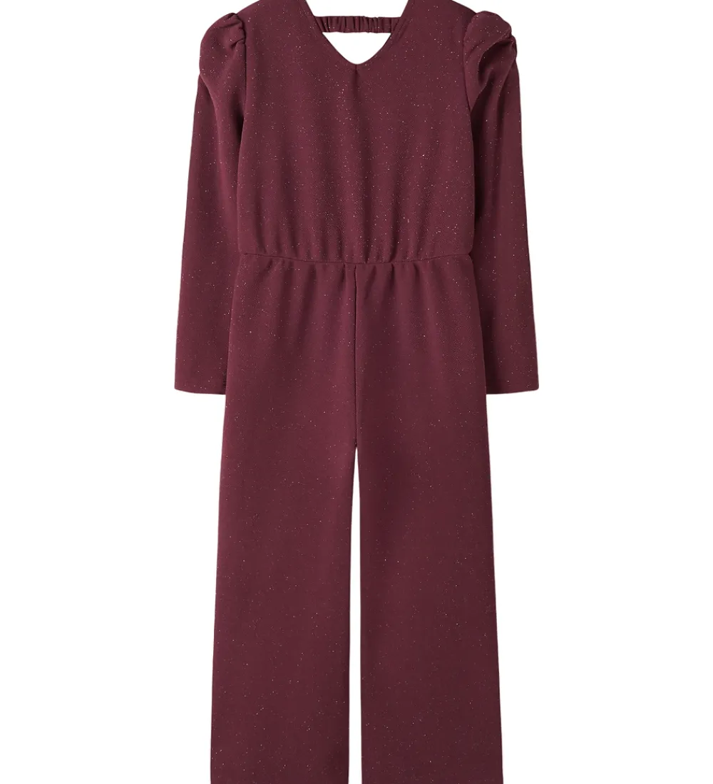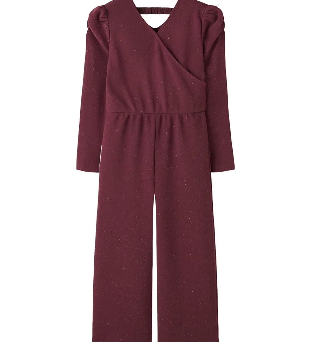 Elegant Name It buksedragt i bordeauxrød med glimmer. Name It buksedragten har lange ærmer og flotte pufdetaljer ved skuldrene. Foran ses en dekorativ slå-om-effekt, som sammen med den elastiske talje giver en god pasform. Øverst i halsen er der en lille trykknap, og i nakken er der en elastisk strop, som holder buksedragten på plads. Buksedragten har vidde i benene og er designet i et blødt materiale for en behagelig oplevelse.